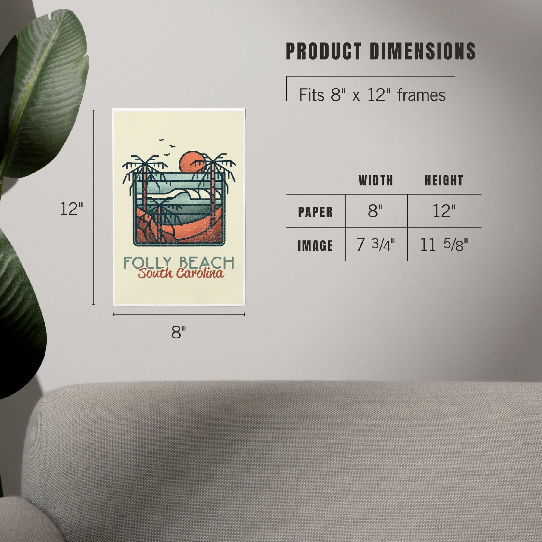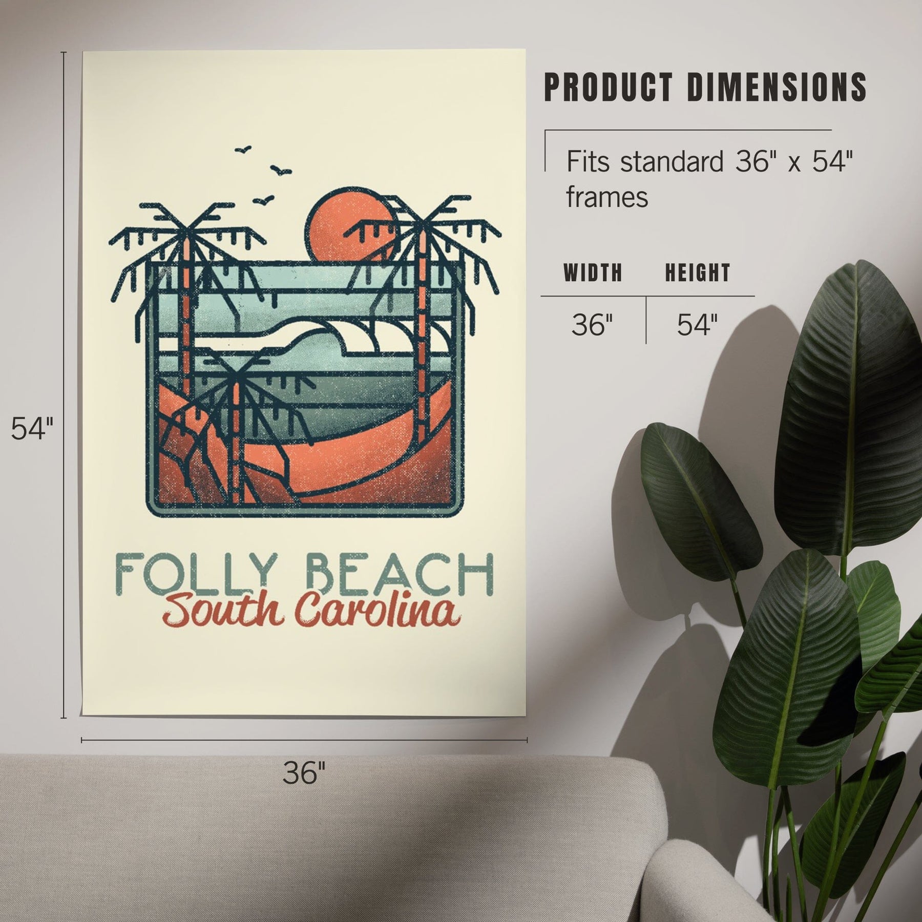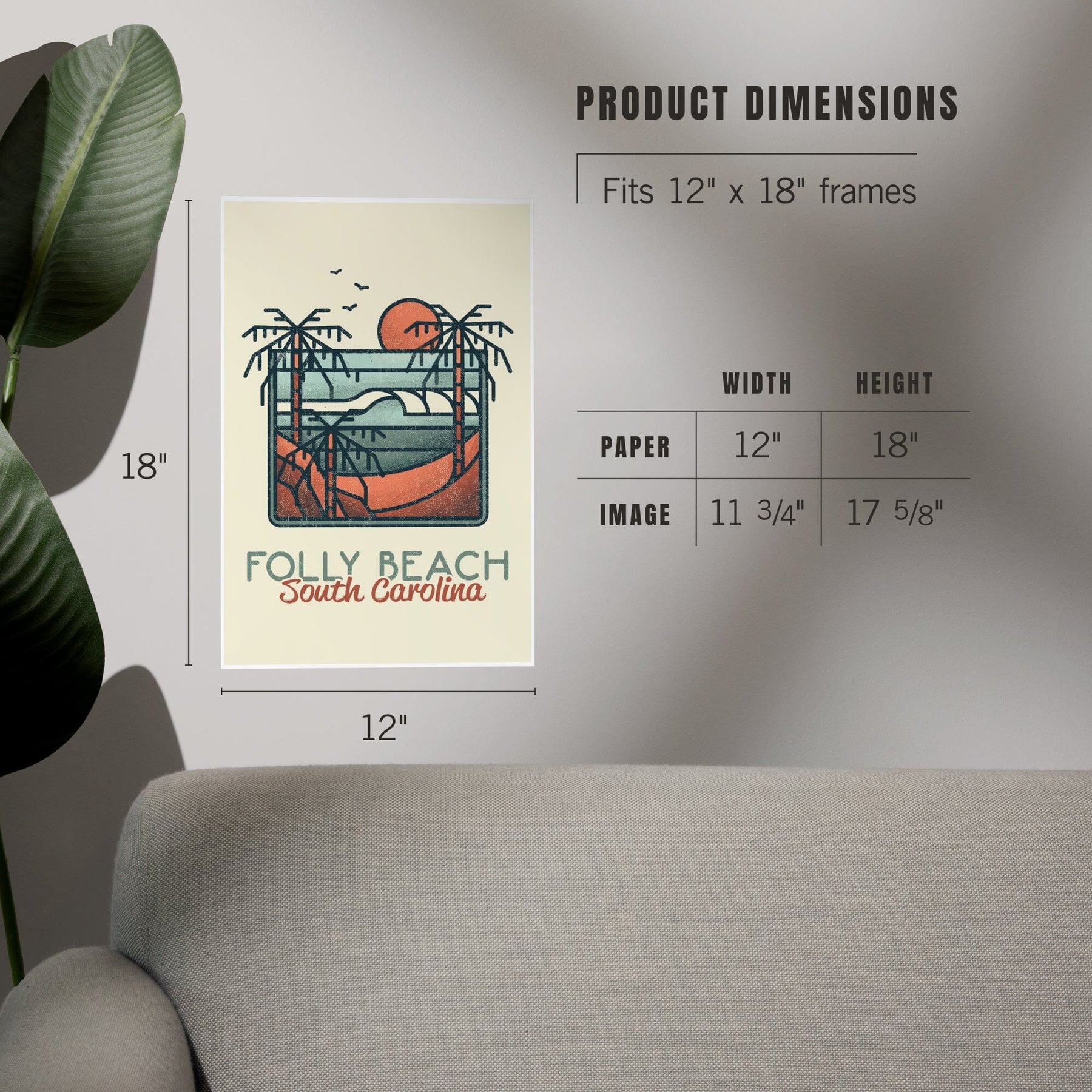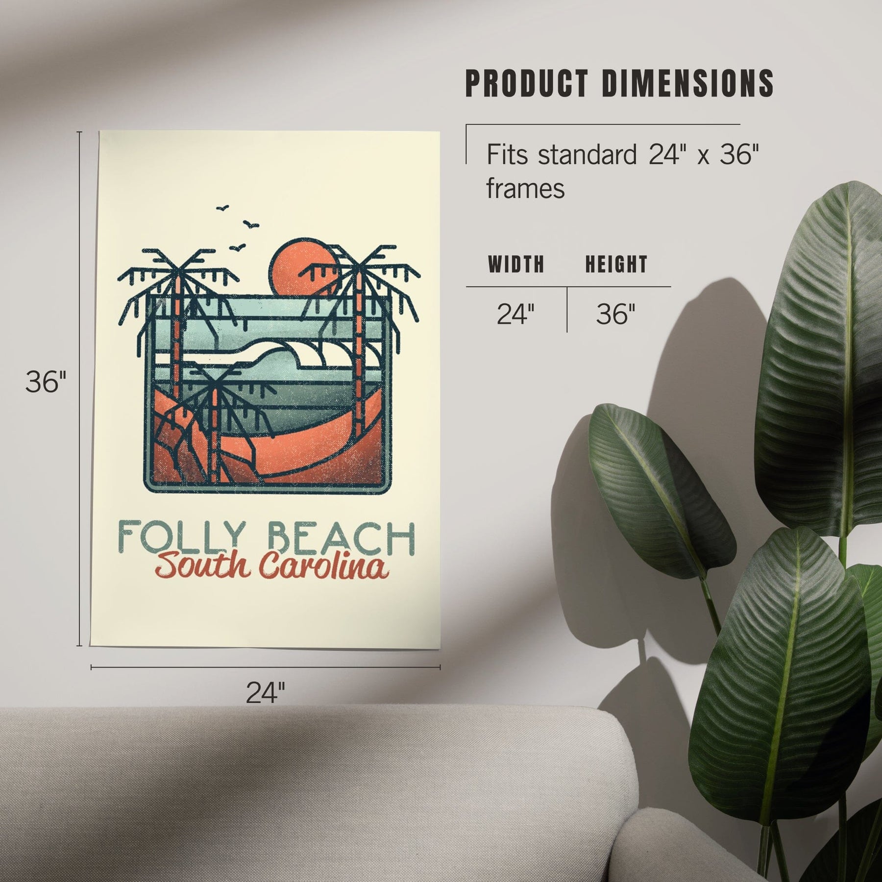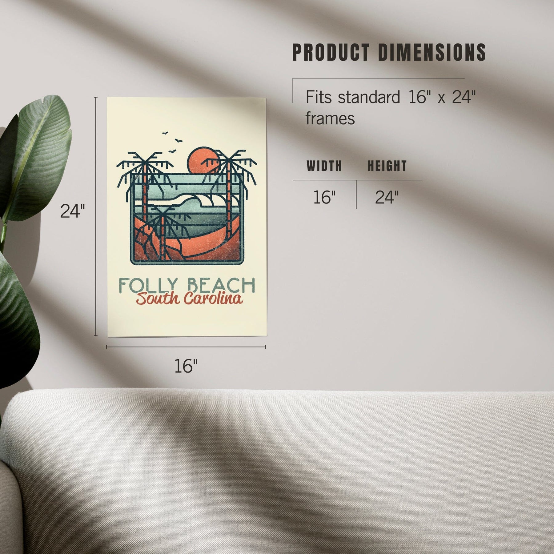 Folly Beach, South Carolina, Palm Trees and Beach Scene, Block Lines, Art & Giclee Prints