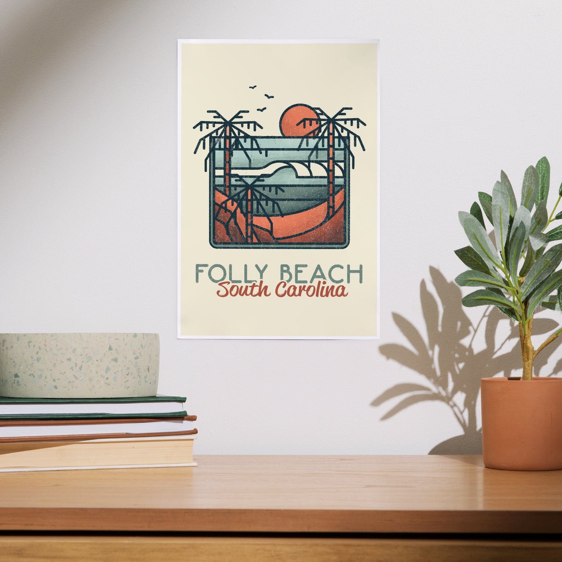 Folly Beach, South Carolina, Palm Trees and Beach Scene, Block Lines, Art & Giclee Prints - Lantern Press