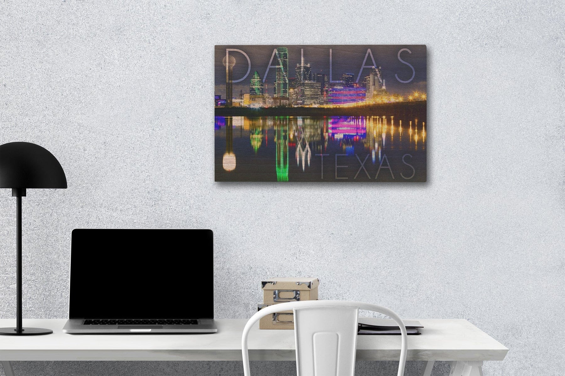 Dallas, Texas, Skyline at Night, Lantern Press Photography, Wood Signs and Postcards - Lantern Press