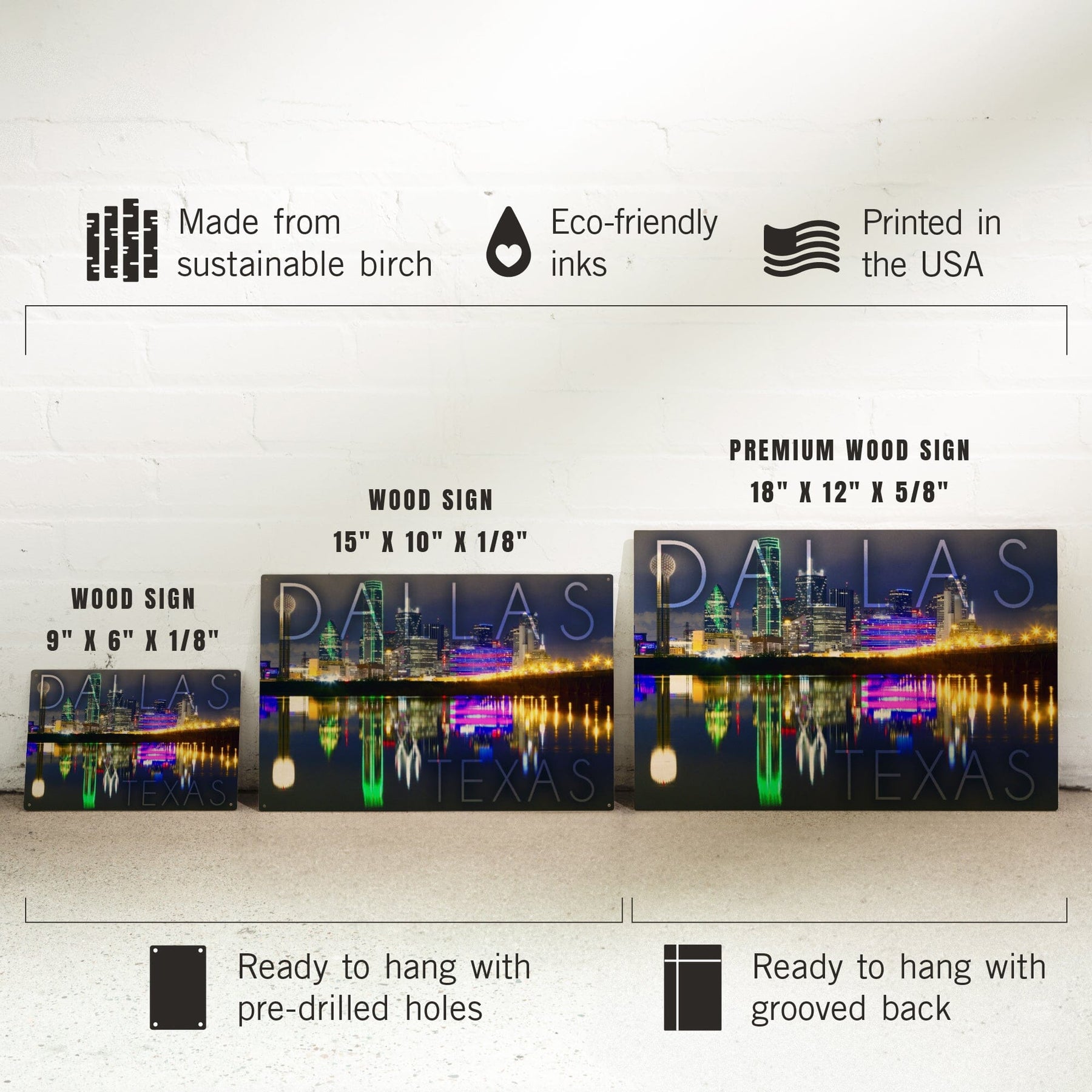 Dallas, Texas, Skyline at Night, Lantern Press Photography, Wood Signs and Postcards