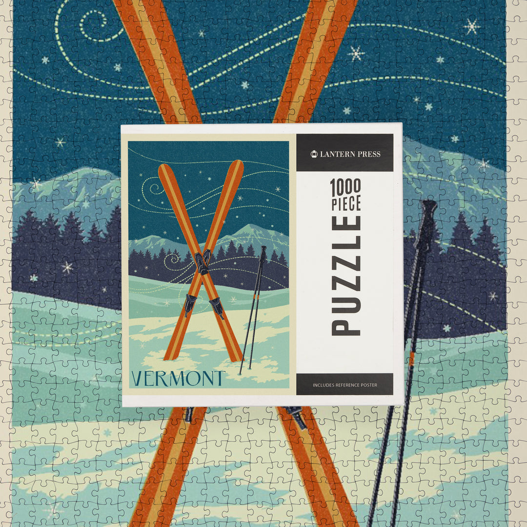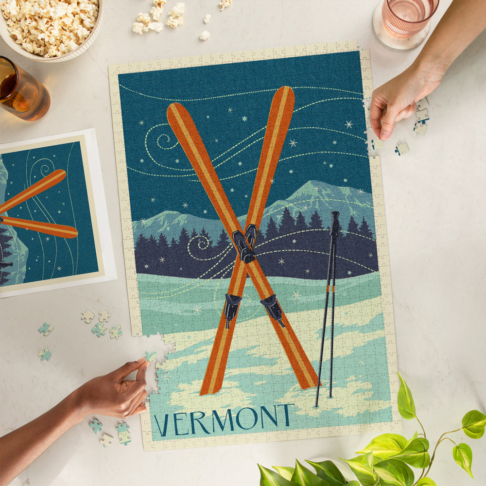 Vermont, Crossed Skis, Letterpress, Jigsaw Puzzle Puzzle Lantern Press