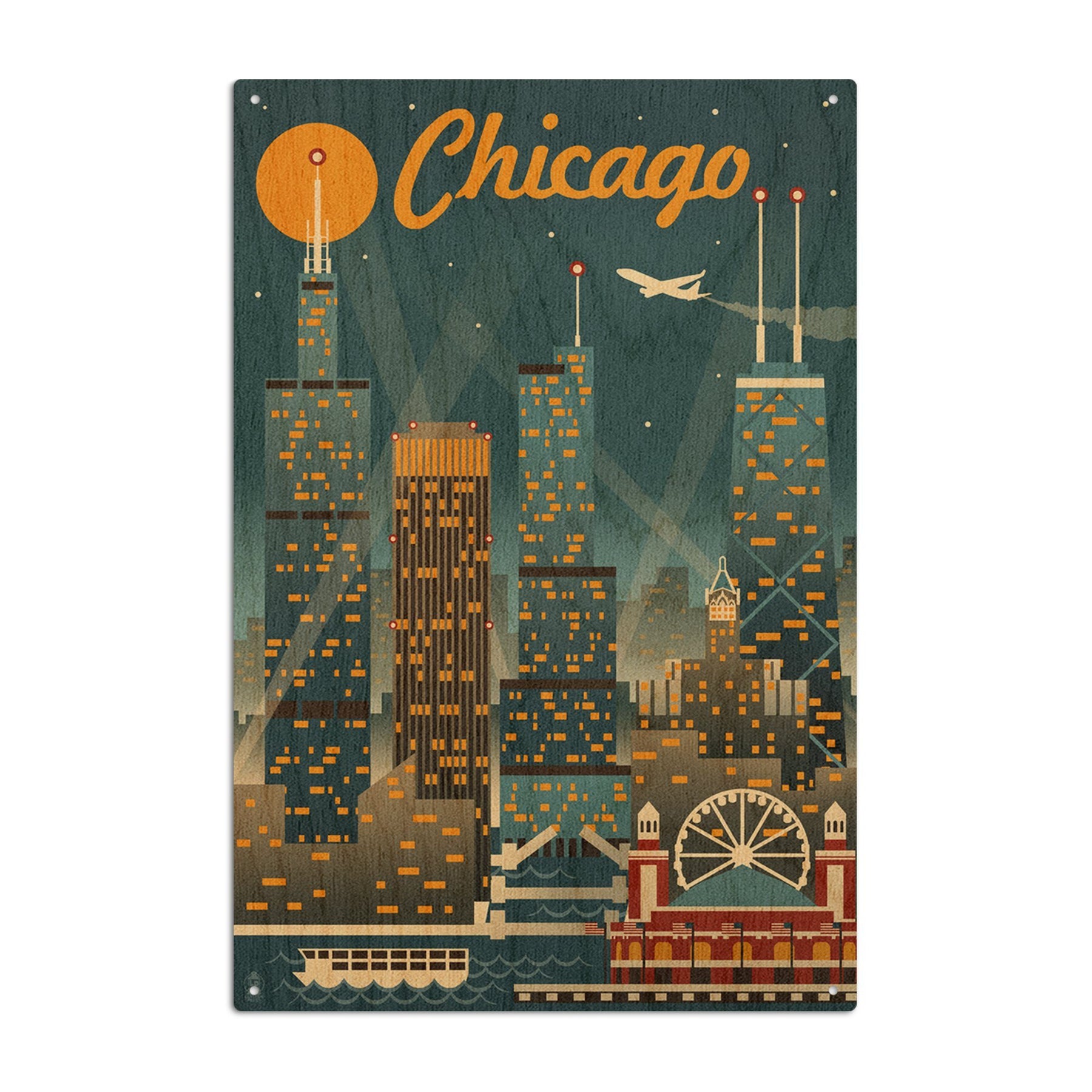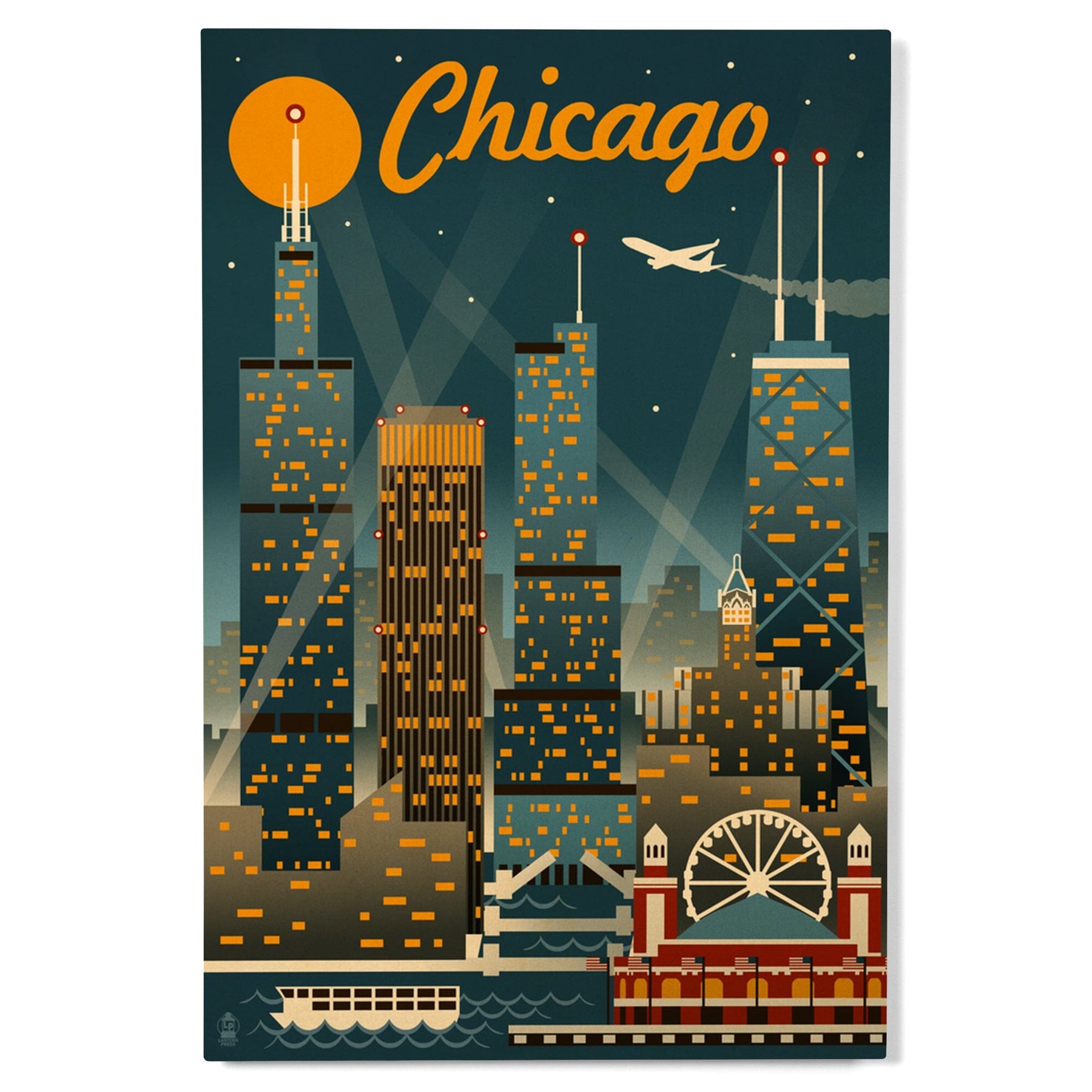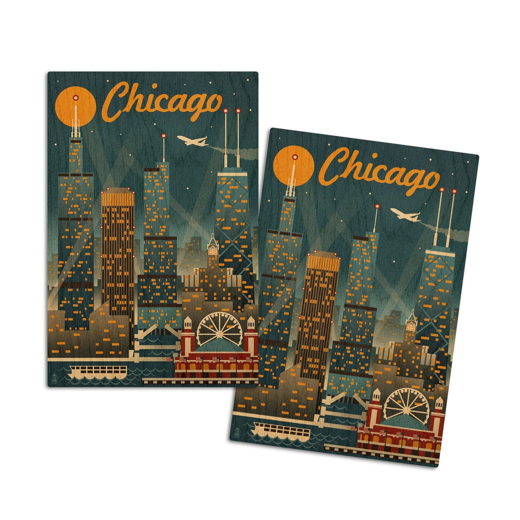 Chicago, Illinois, Retro Skyline, Lantern Press Artwork, Wood Signs and Postcards - Lantern Press