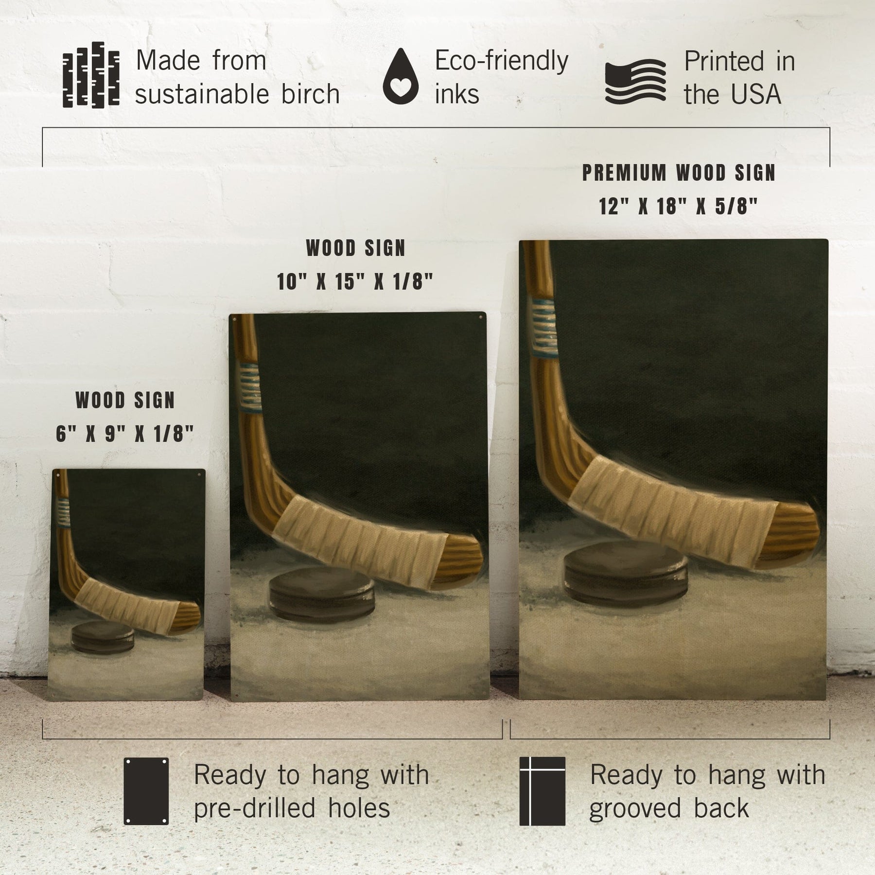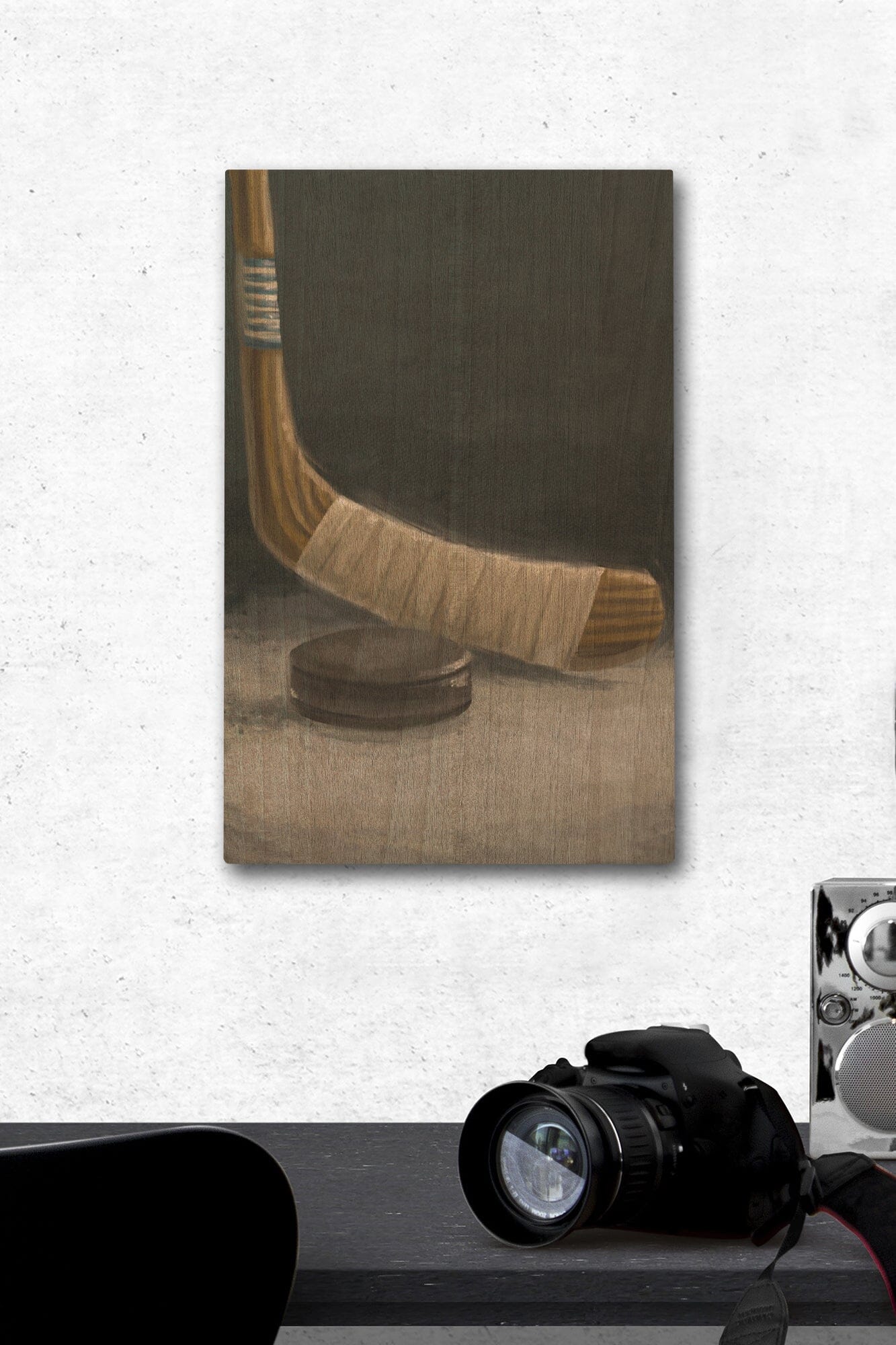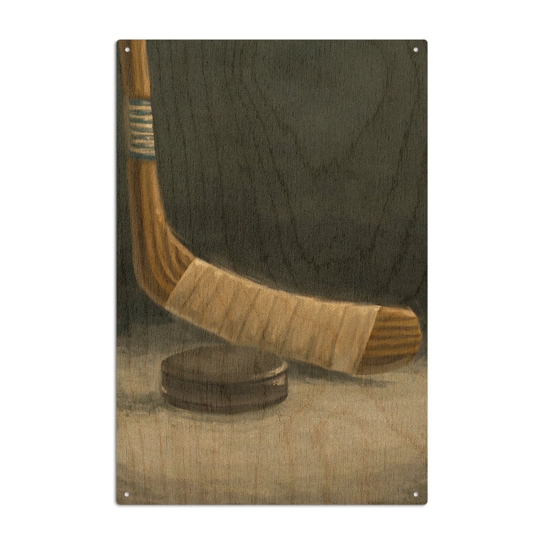 Hockey Stick & Puck, Oil Painting, Lantern Press Artwork, Wood Signs and Postcards
