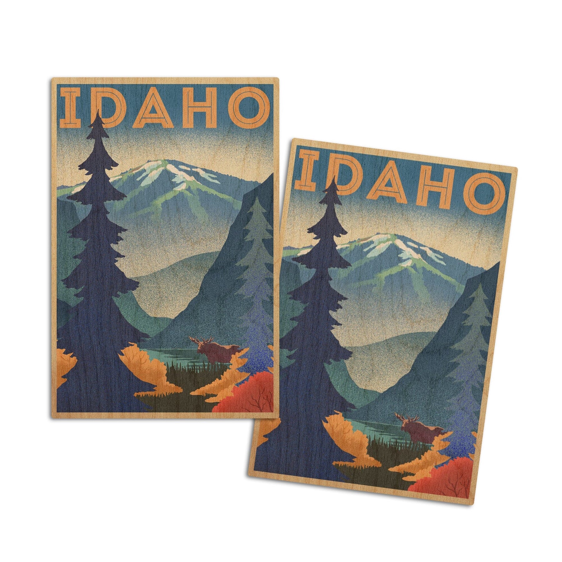 Idaho, Moose & Mountain, Lithograph, Lantern Press Artwork, Wood Signs and Postcards
