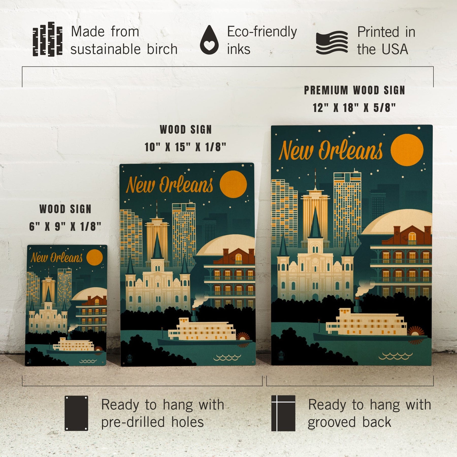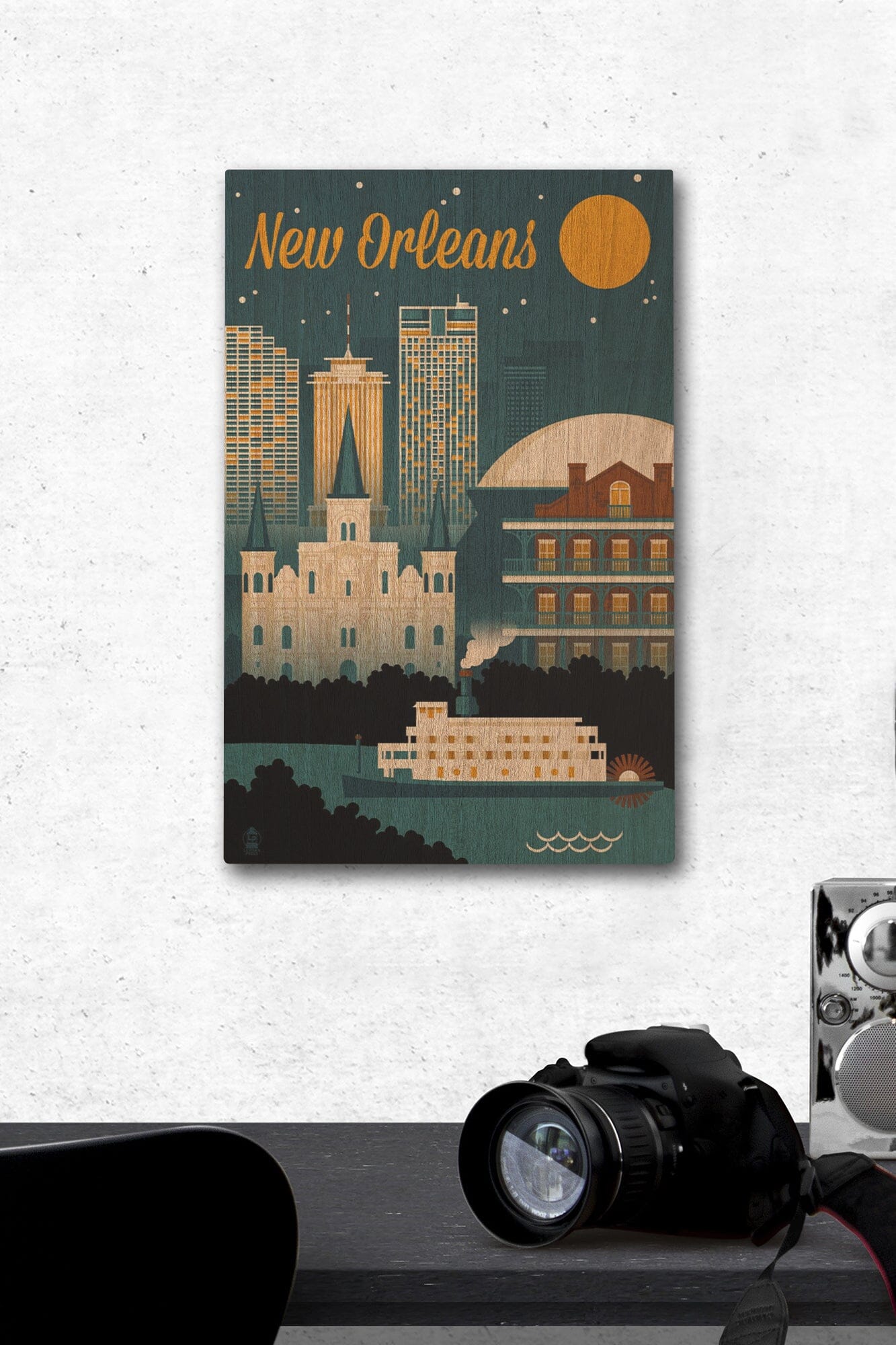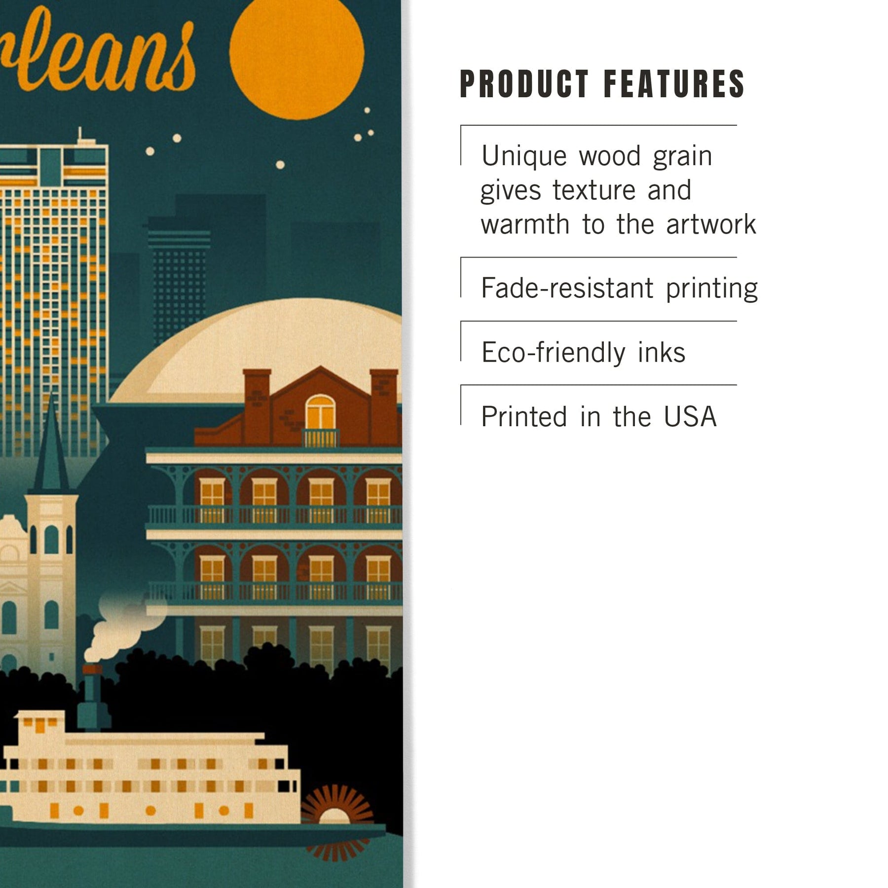 New Orleans, Louisiana, Retro Skyline, Lantern Press Artwork, Wood Signs and Postcards Wood Lantern Press