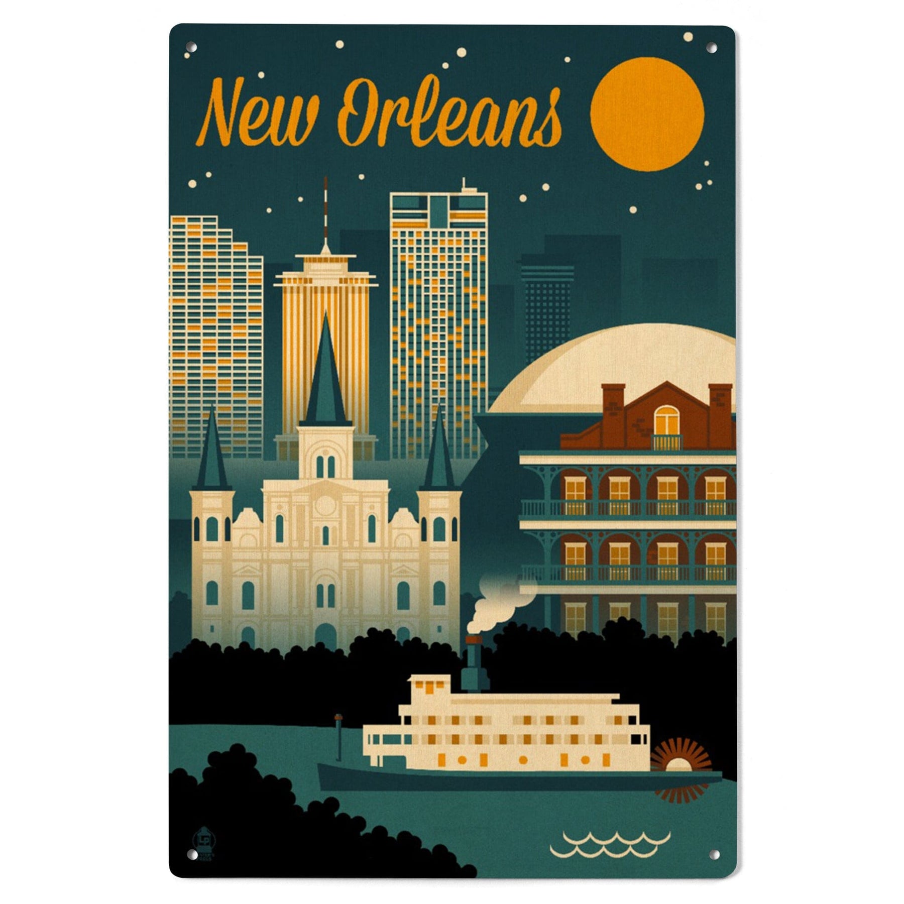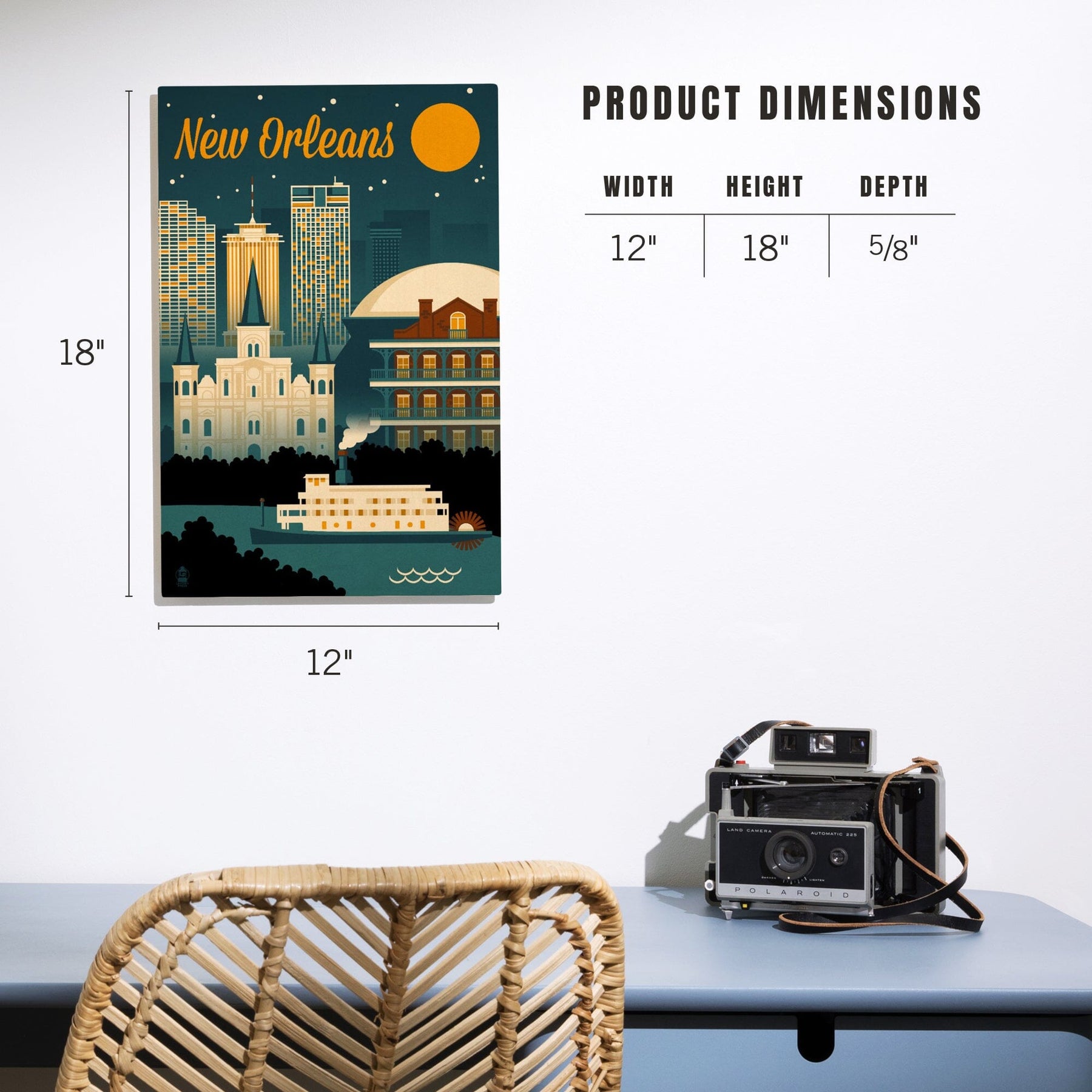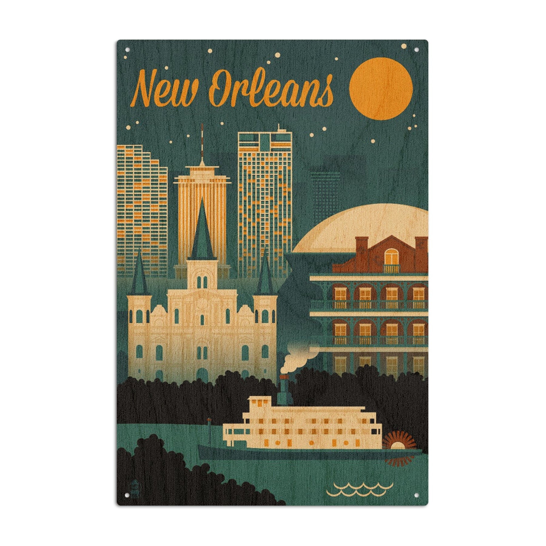 New Orleans, Louisiana, Retro Skyline, Lantern Press Artwork, Wood Signs and Postcards Wood Lantern Press
