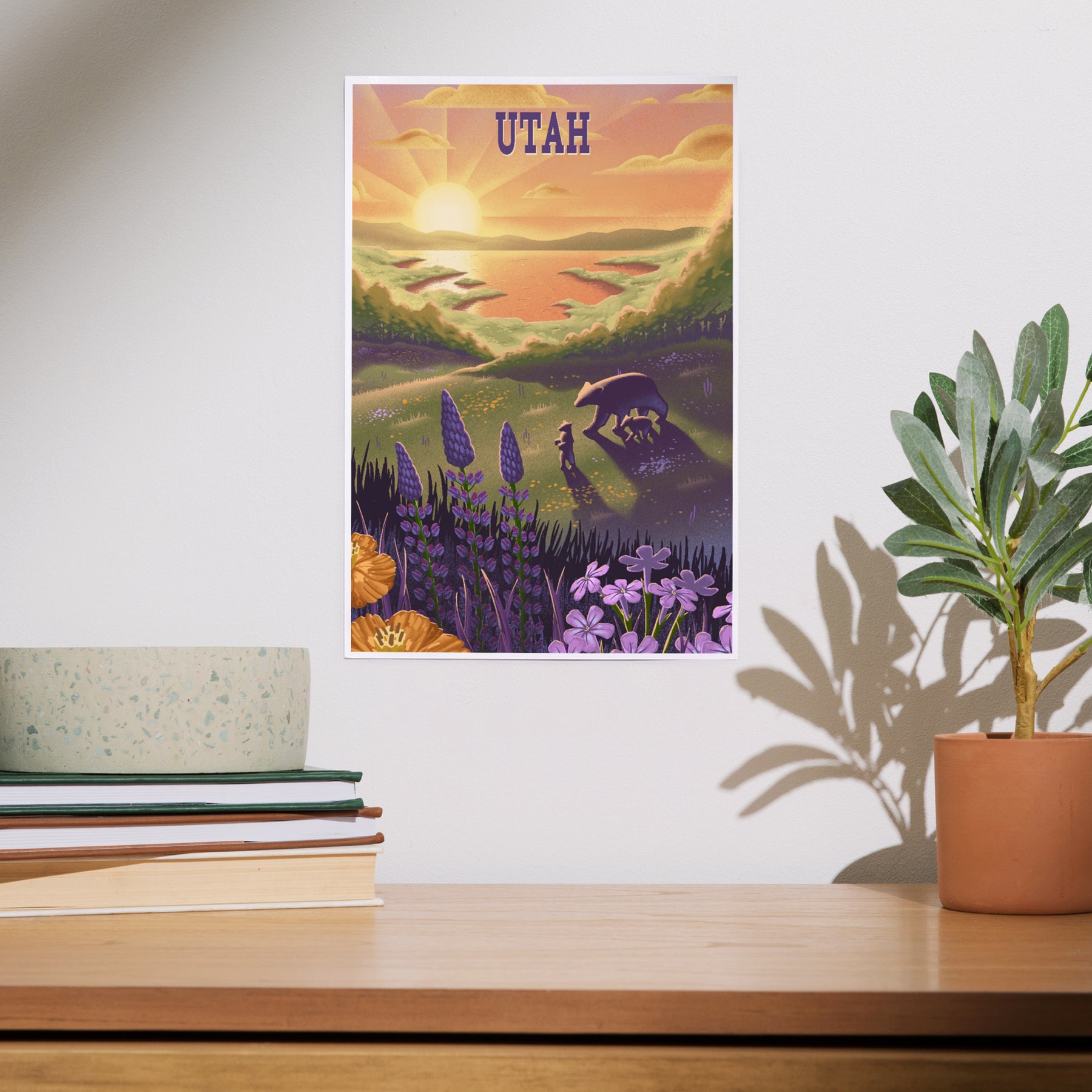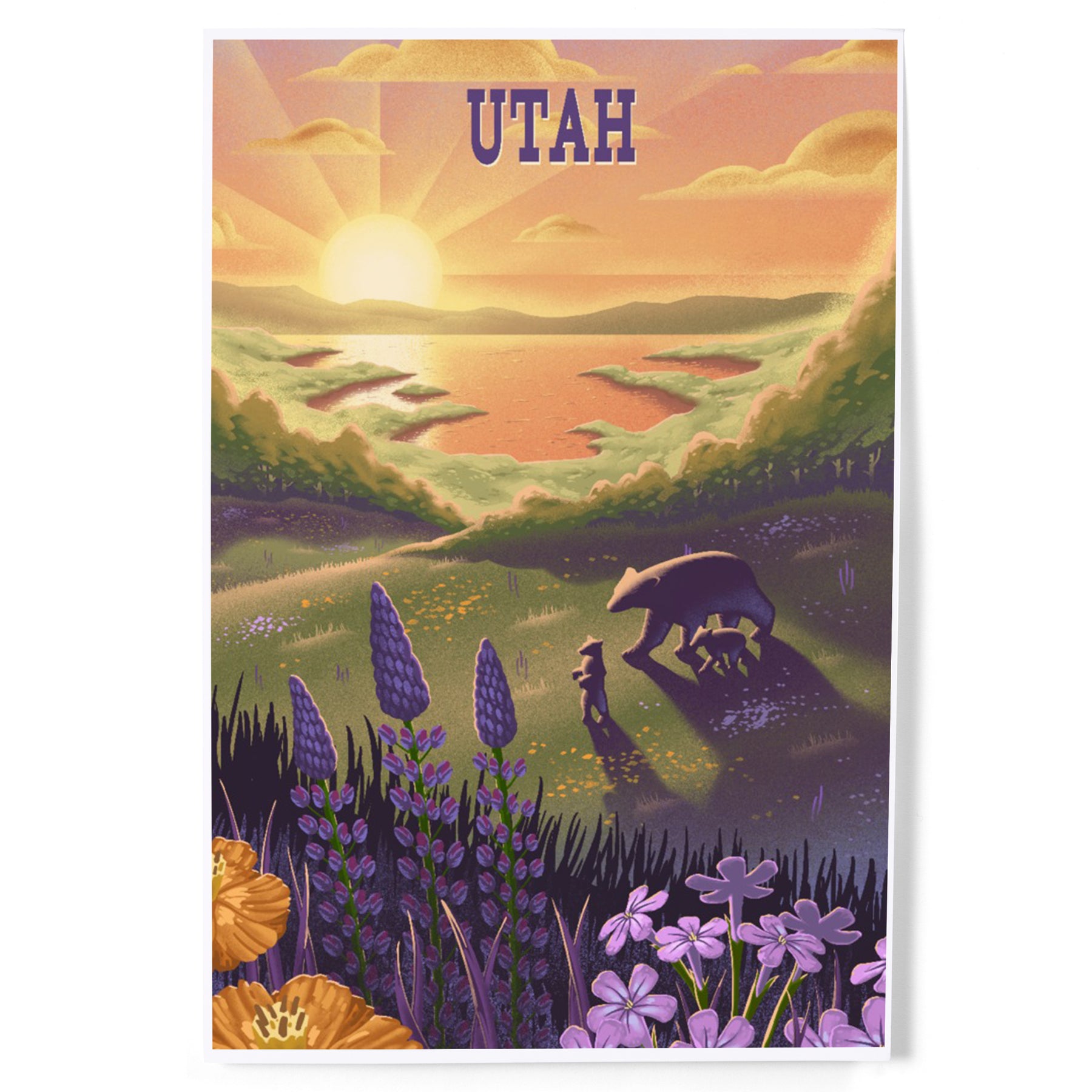 Utah, Lithograph, Bear and Spring Flowers, Lake, Art & Giclee Prints Art Lantern Press