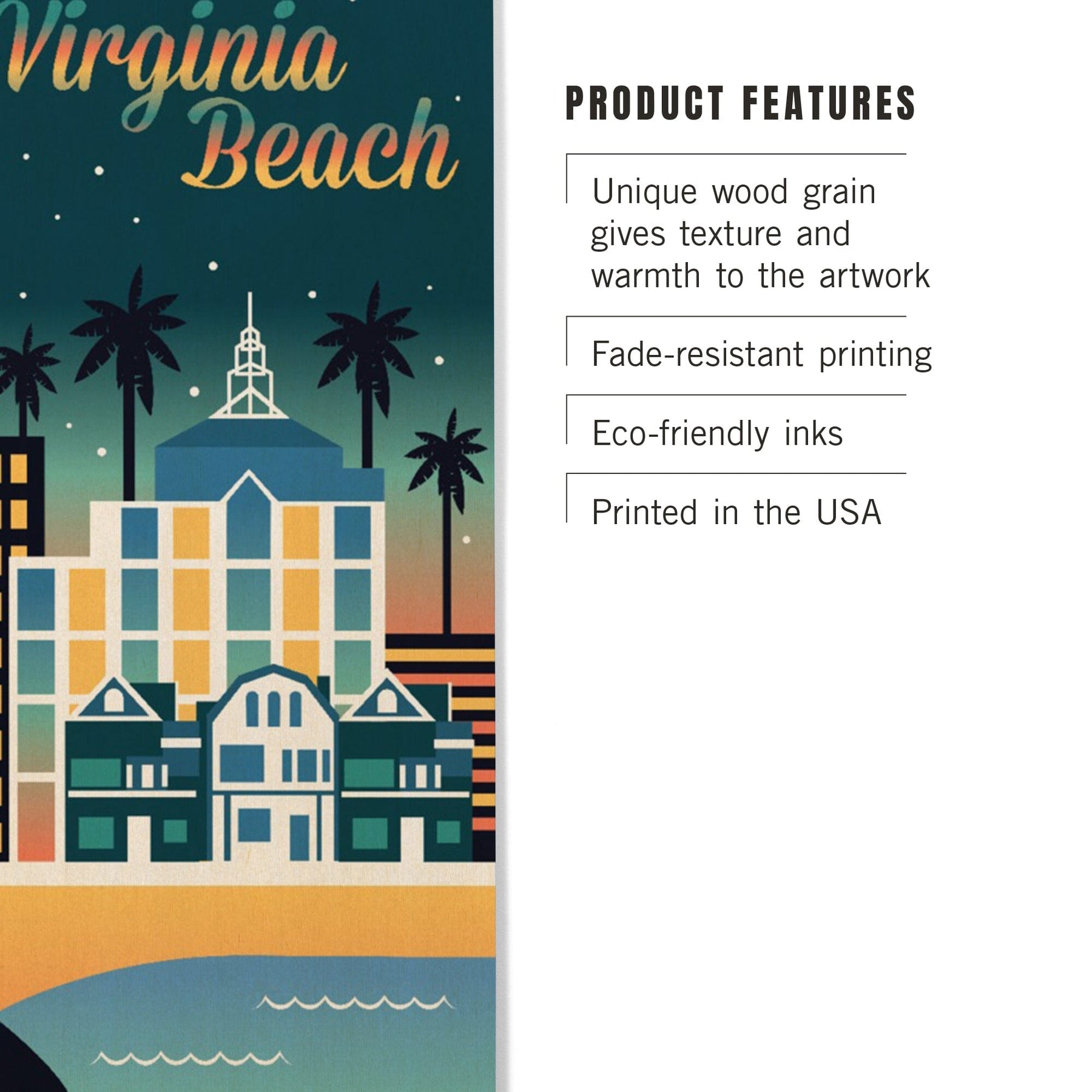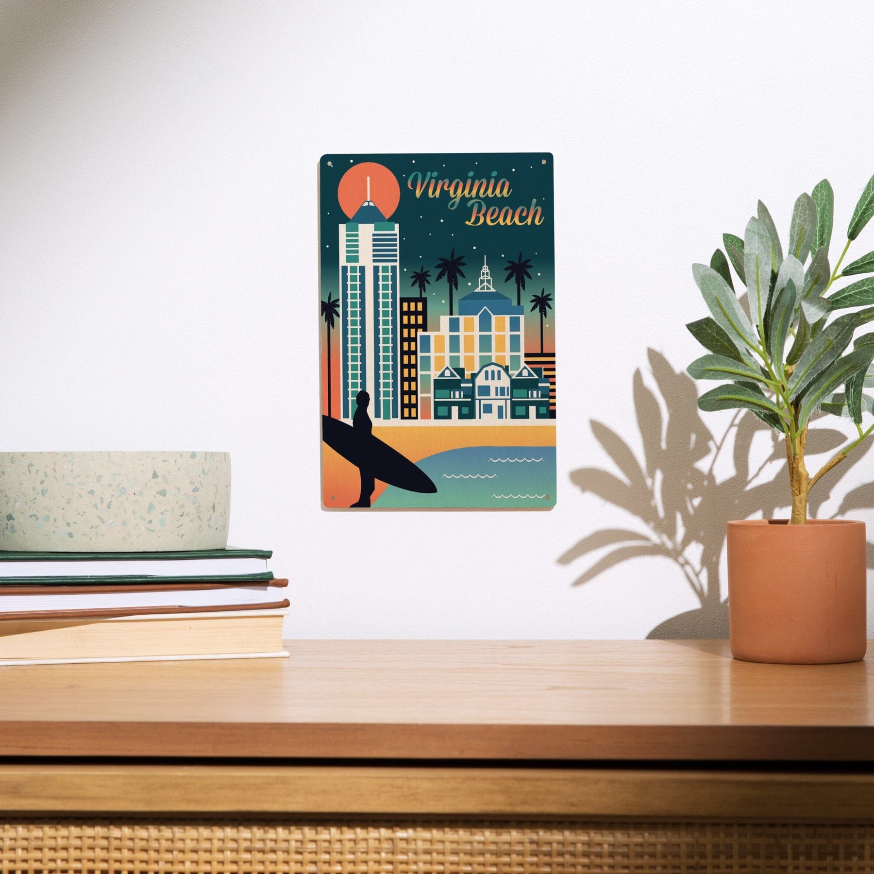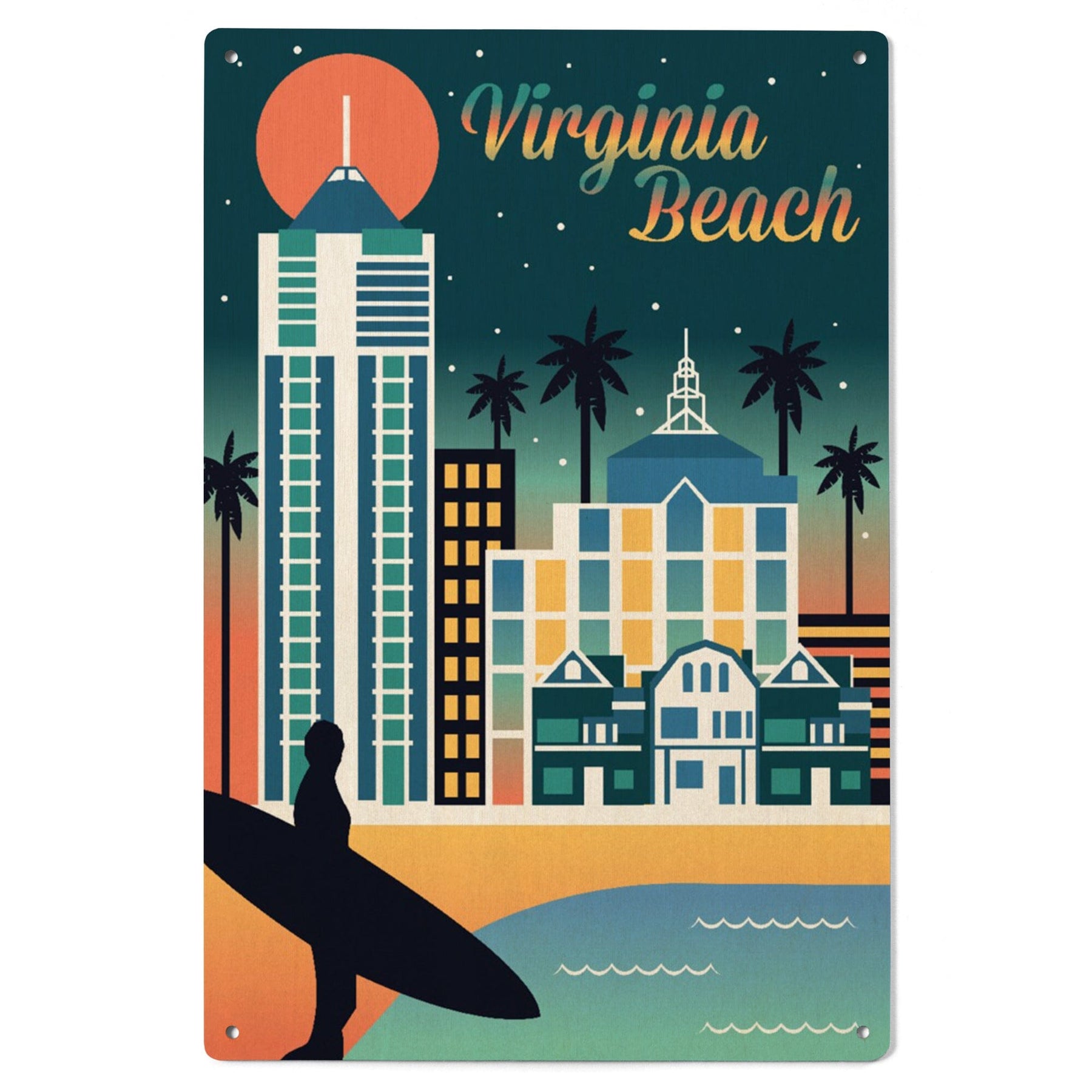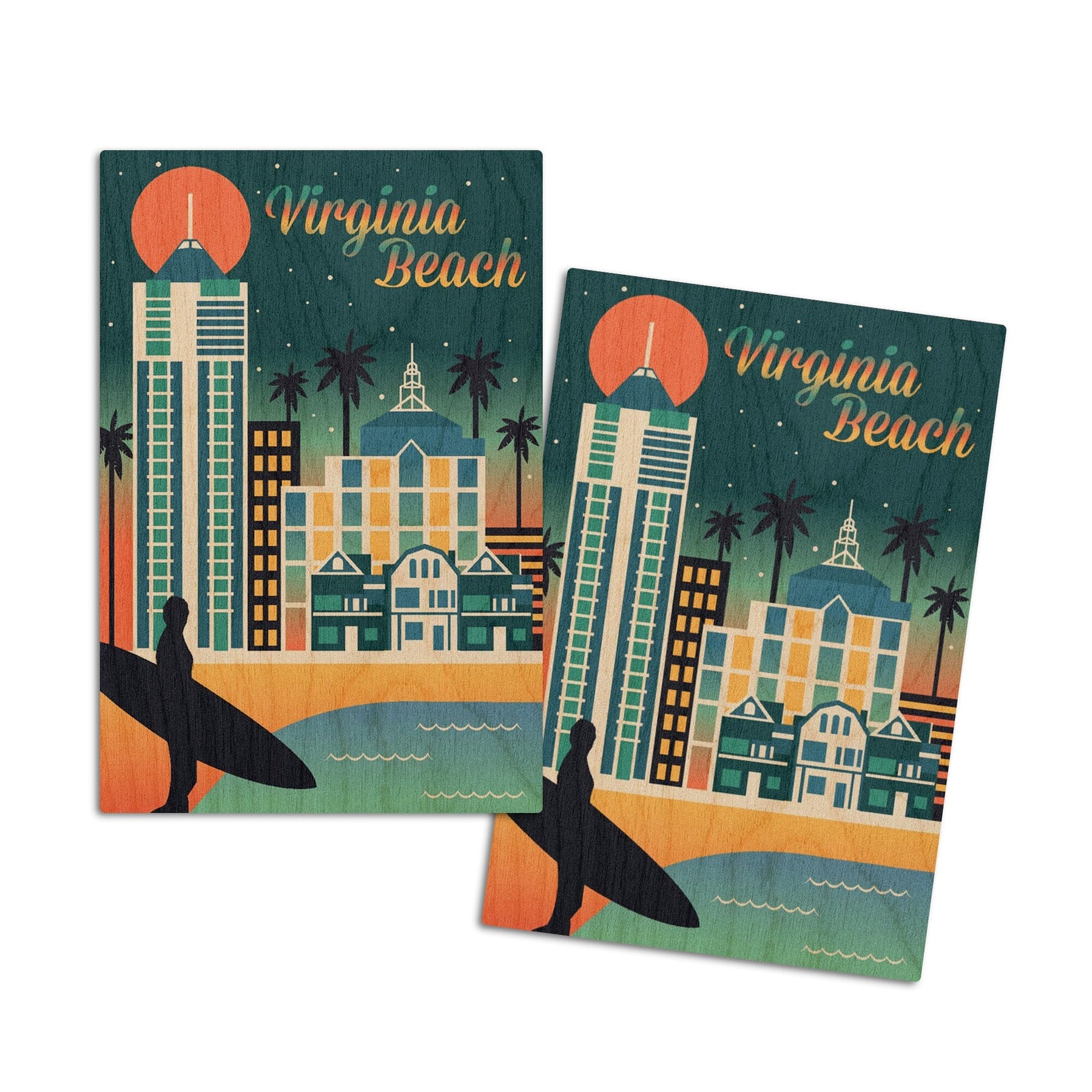 Virginia Beach, Virginia, Retro Skyline Chromatic Series, Lantern Press Artwork, Wood Signs and Postcards