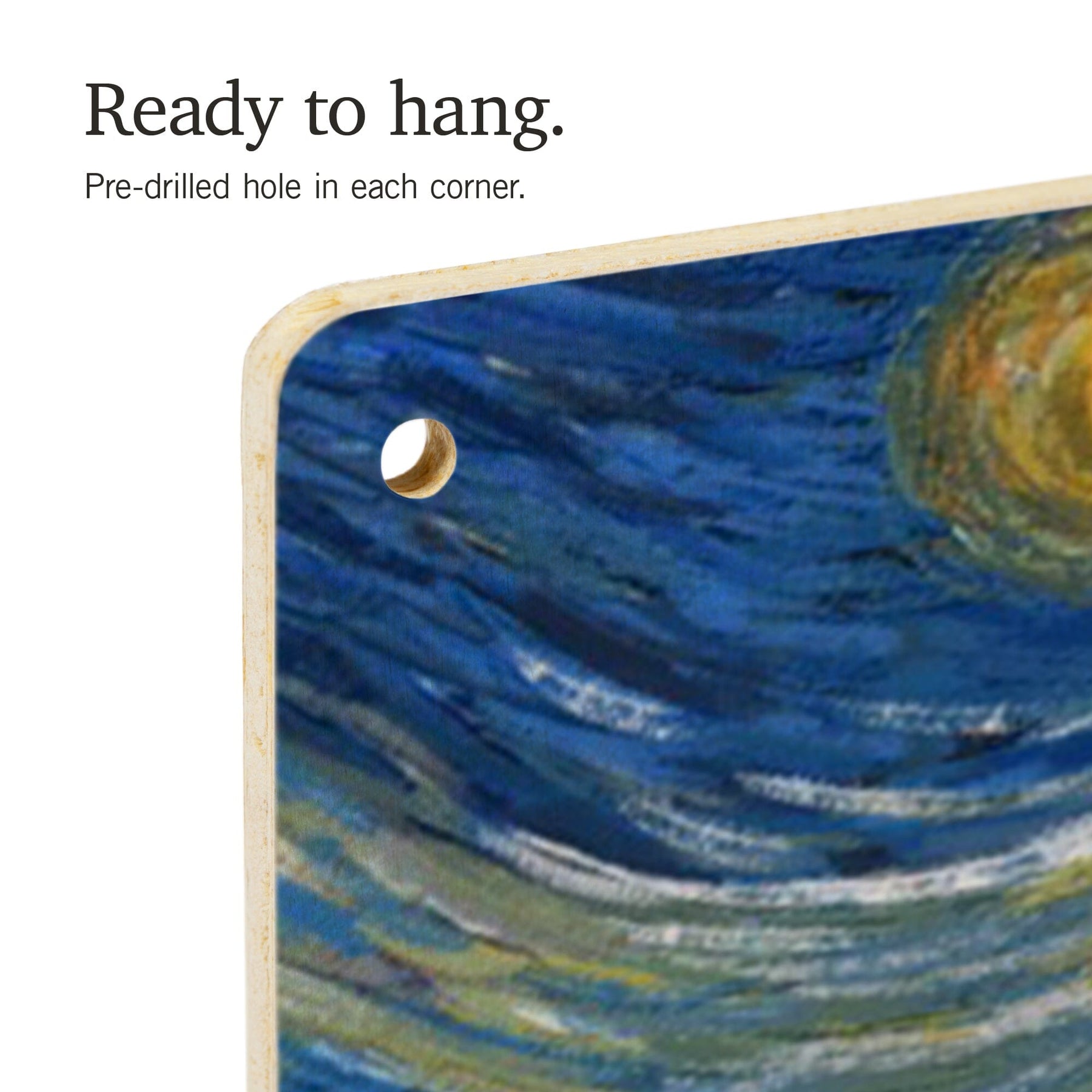 • Hole in each corner, ready to hang