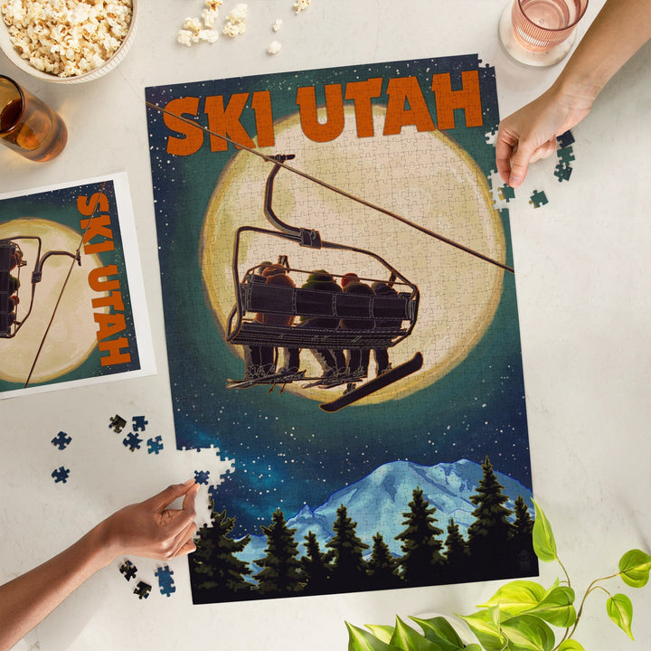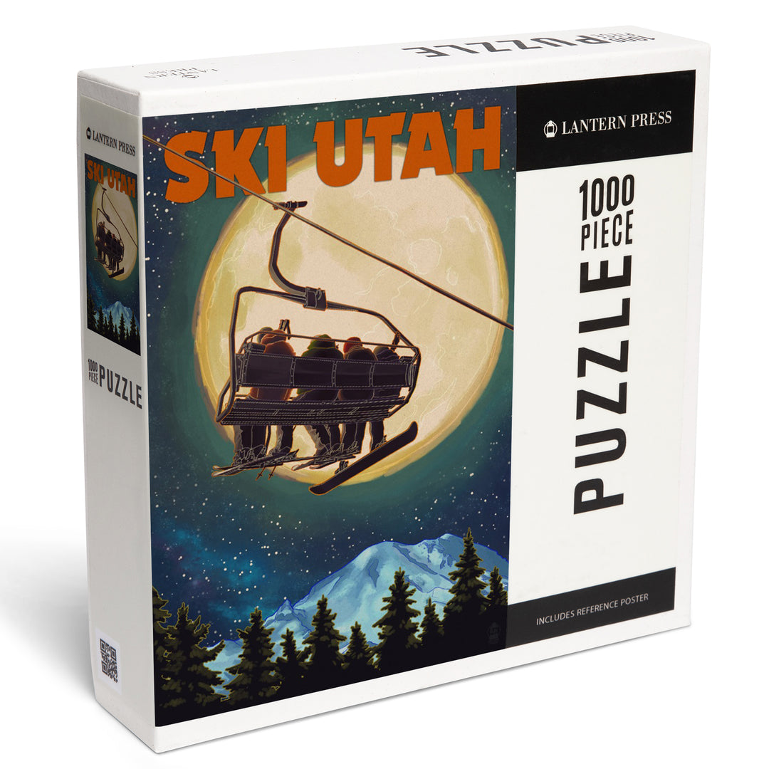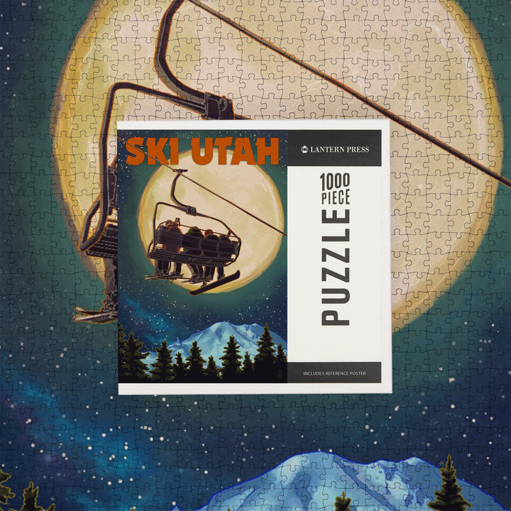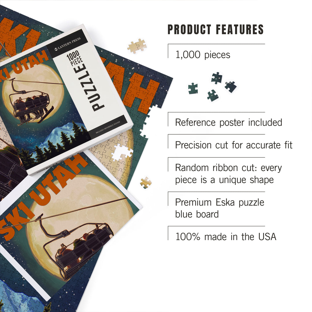 Ski Utah, Ski Lift and Full Moon, Jigsaw Puzzle Puzzle Lantern Press