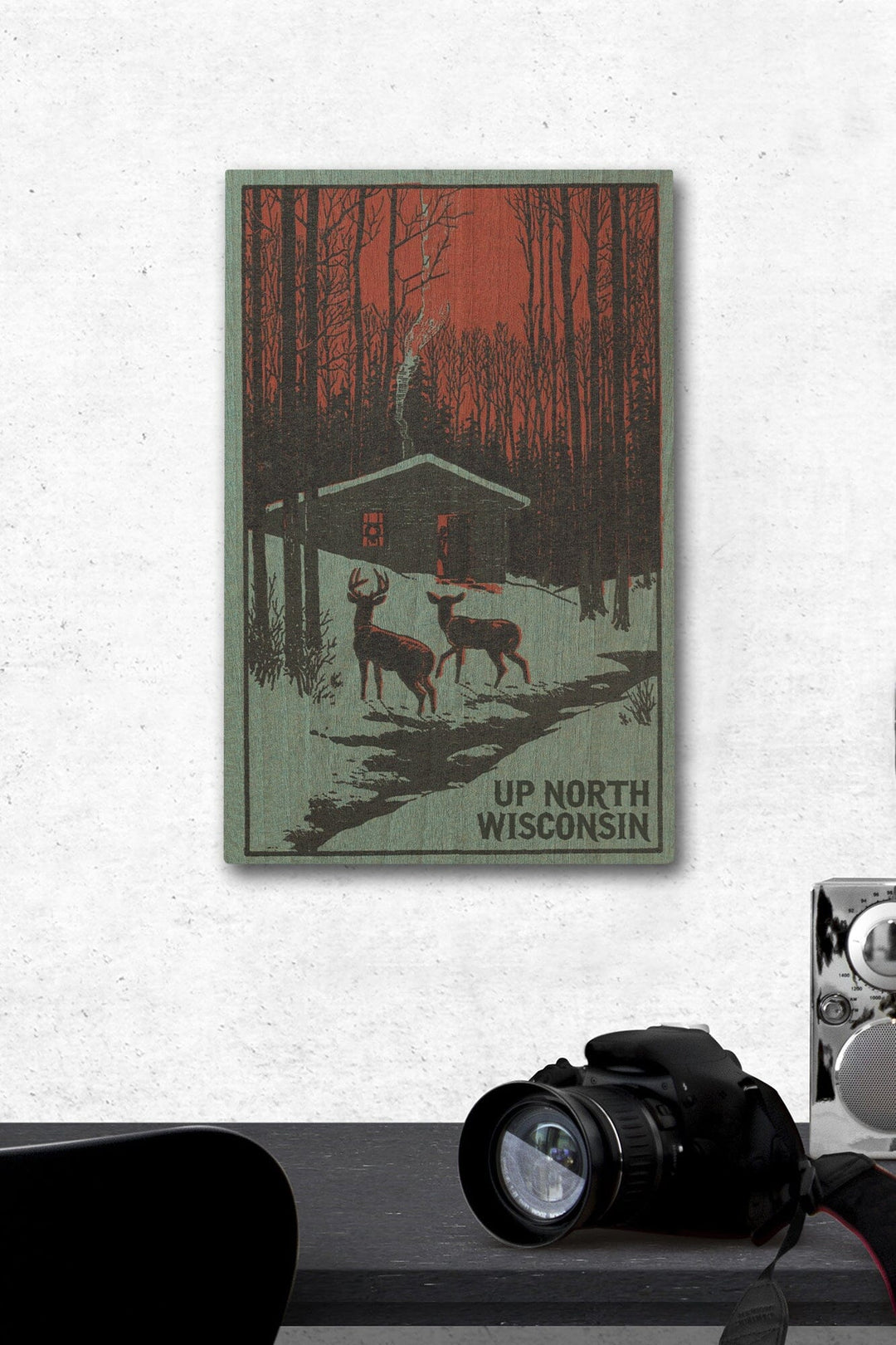 Up North, Wisconsin, Deer & Cabin in Winter, Woodblock, Lantern Press Artwork, Wood Signs and Postcards Wood Lantern Press