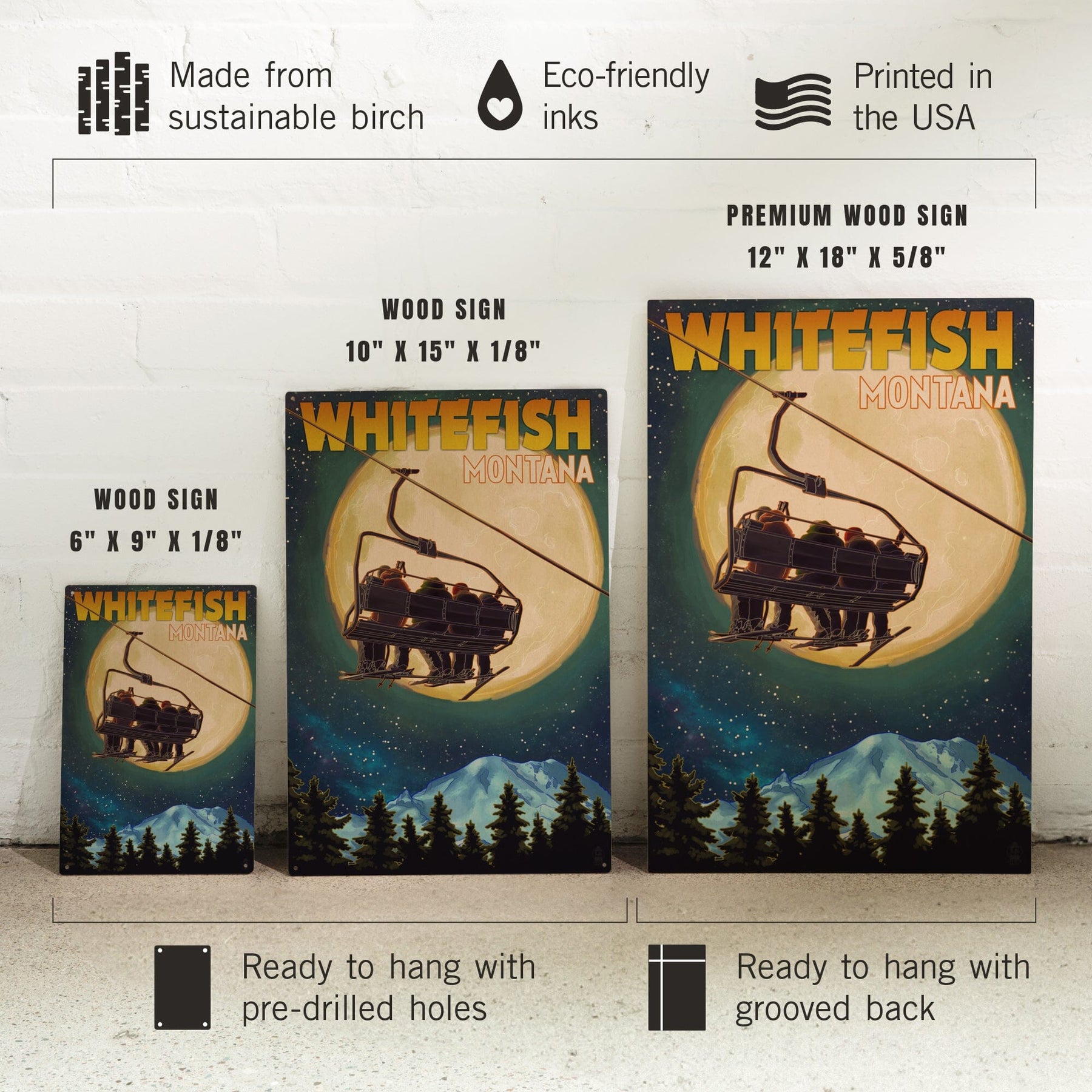 Whitefish, Montana, Ski Lift and Full Moon, Lantern Press Artwork, Wood Signs and Postcards Wood Lantern Press