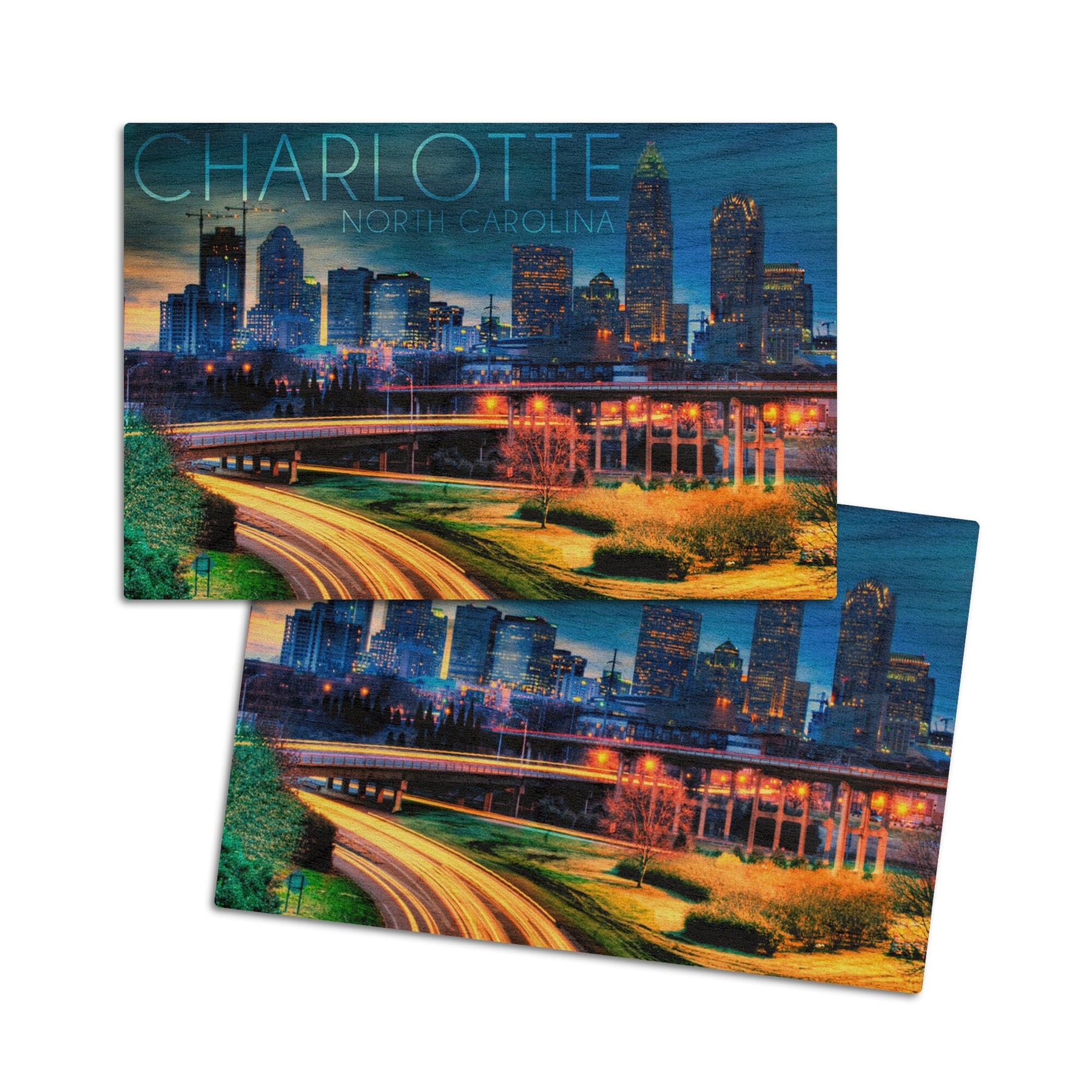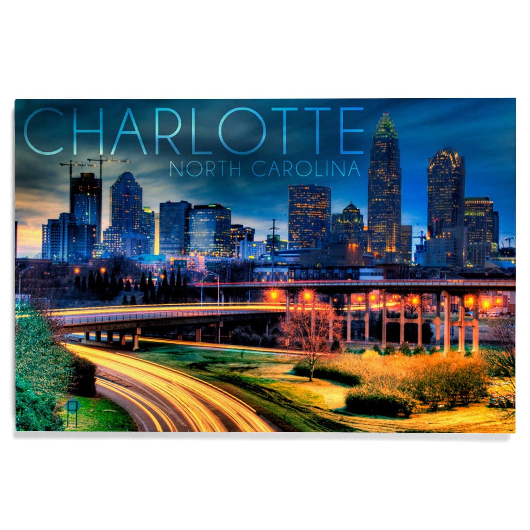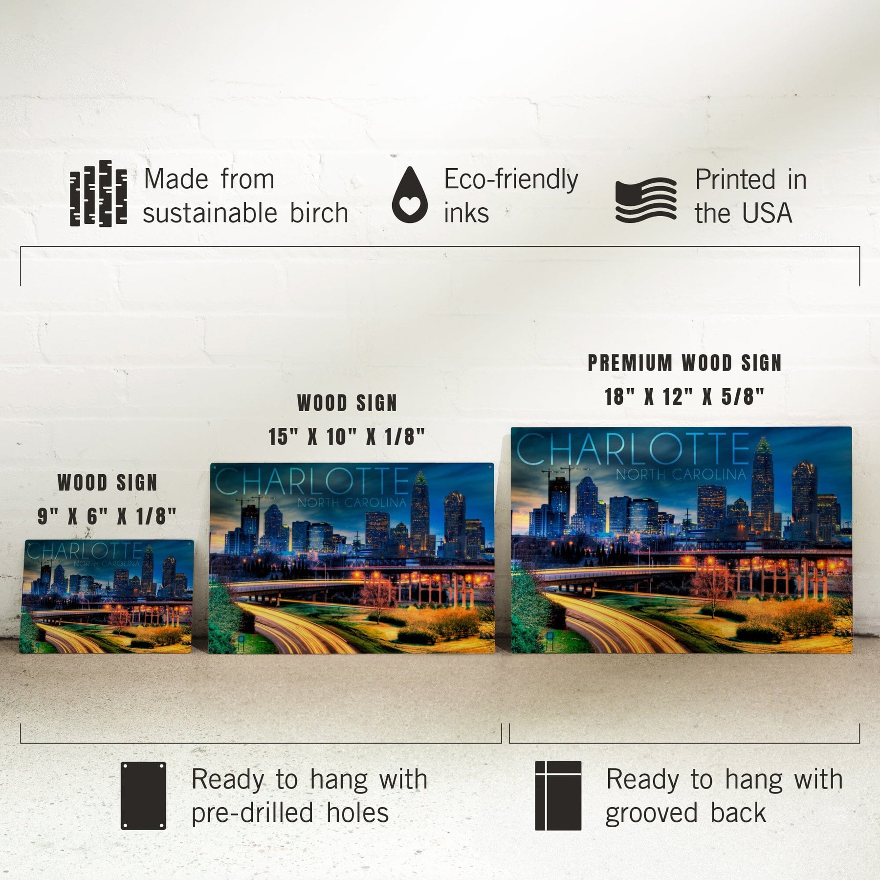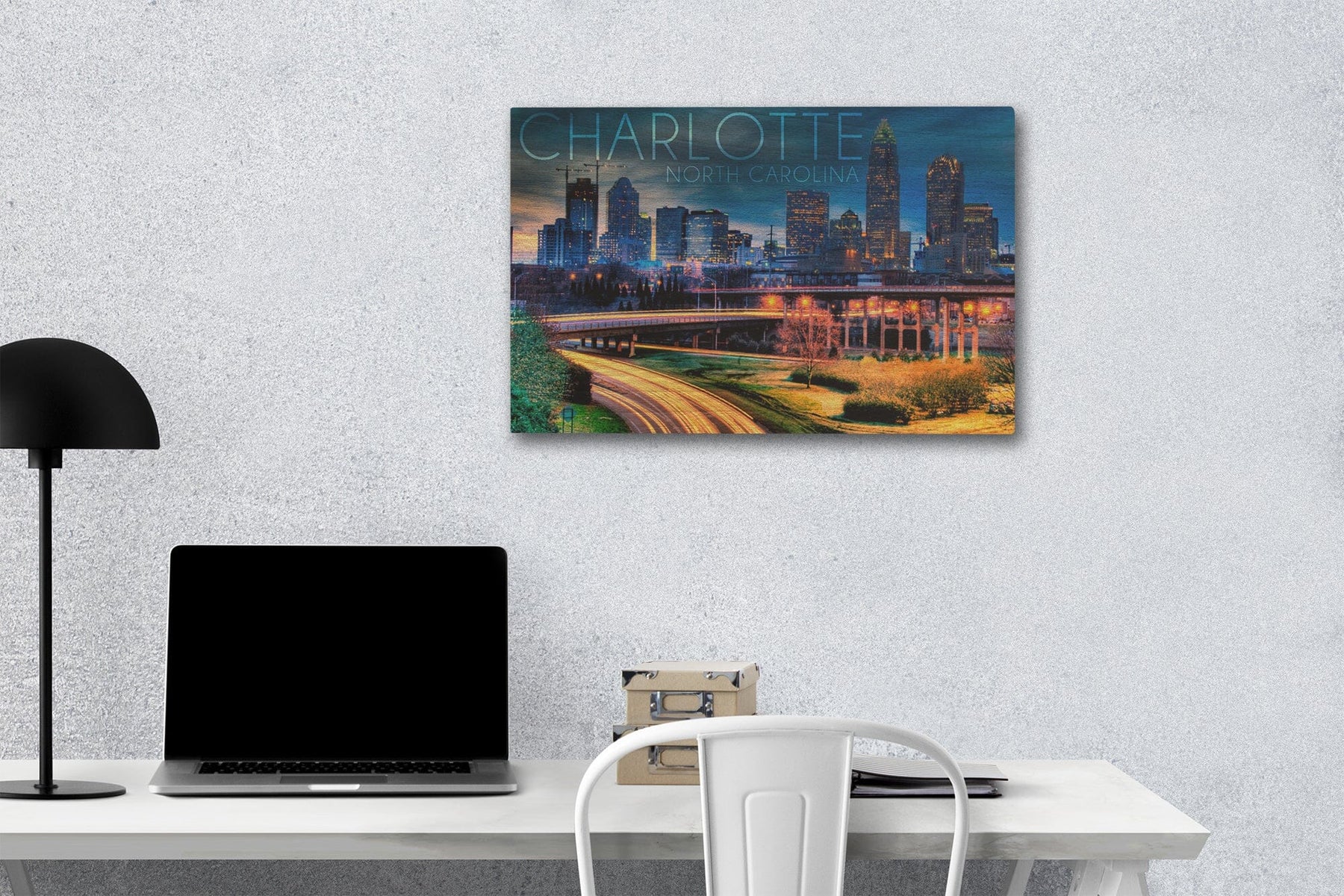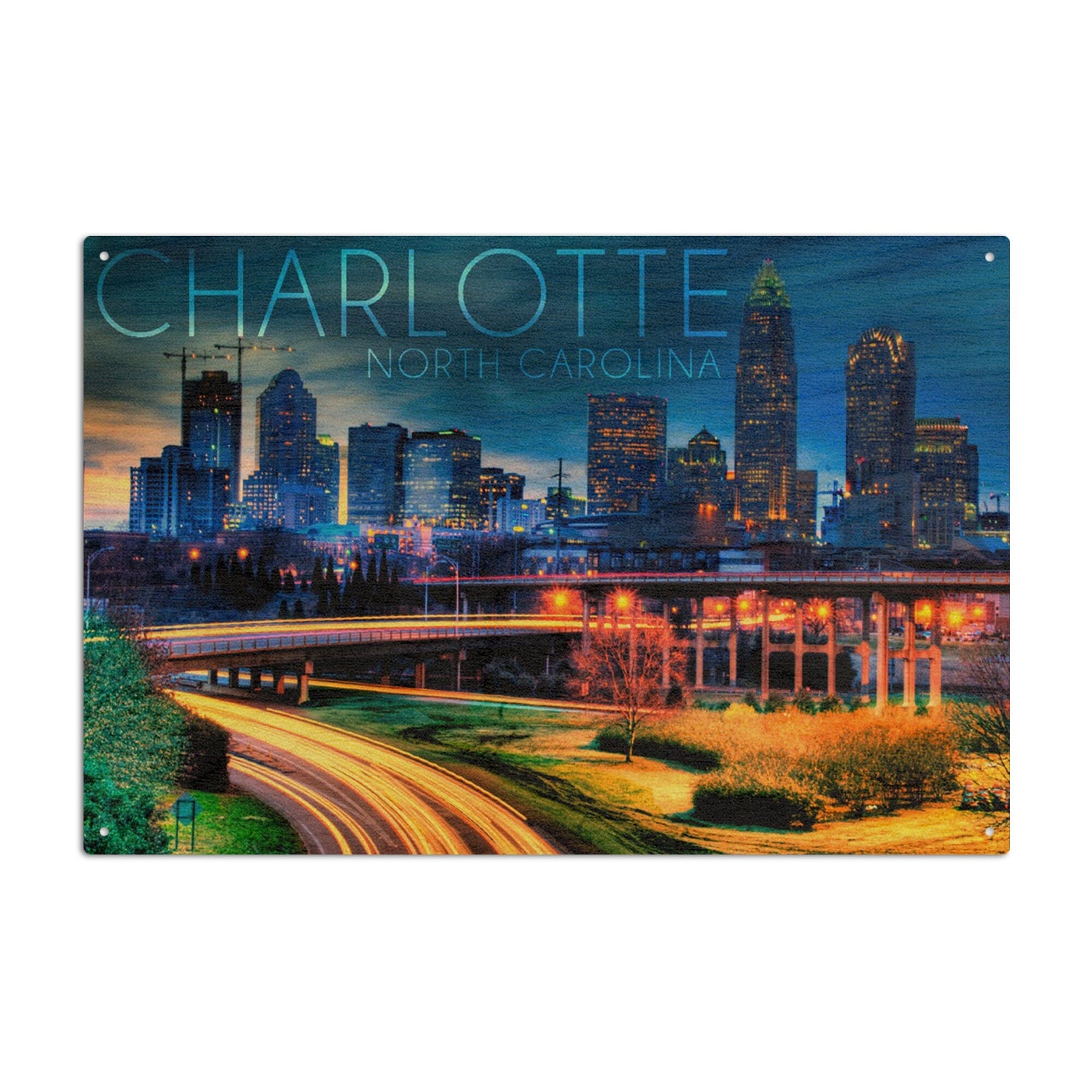 Charlotte, North Carolina, Skyline at Night, Lantern Press Photography, Wood Signs and Postcards