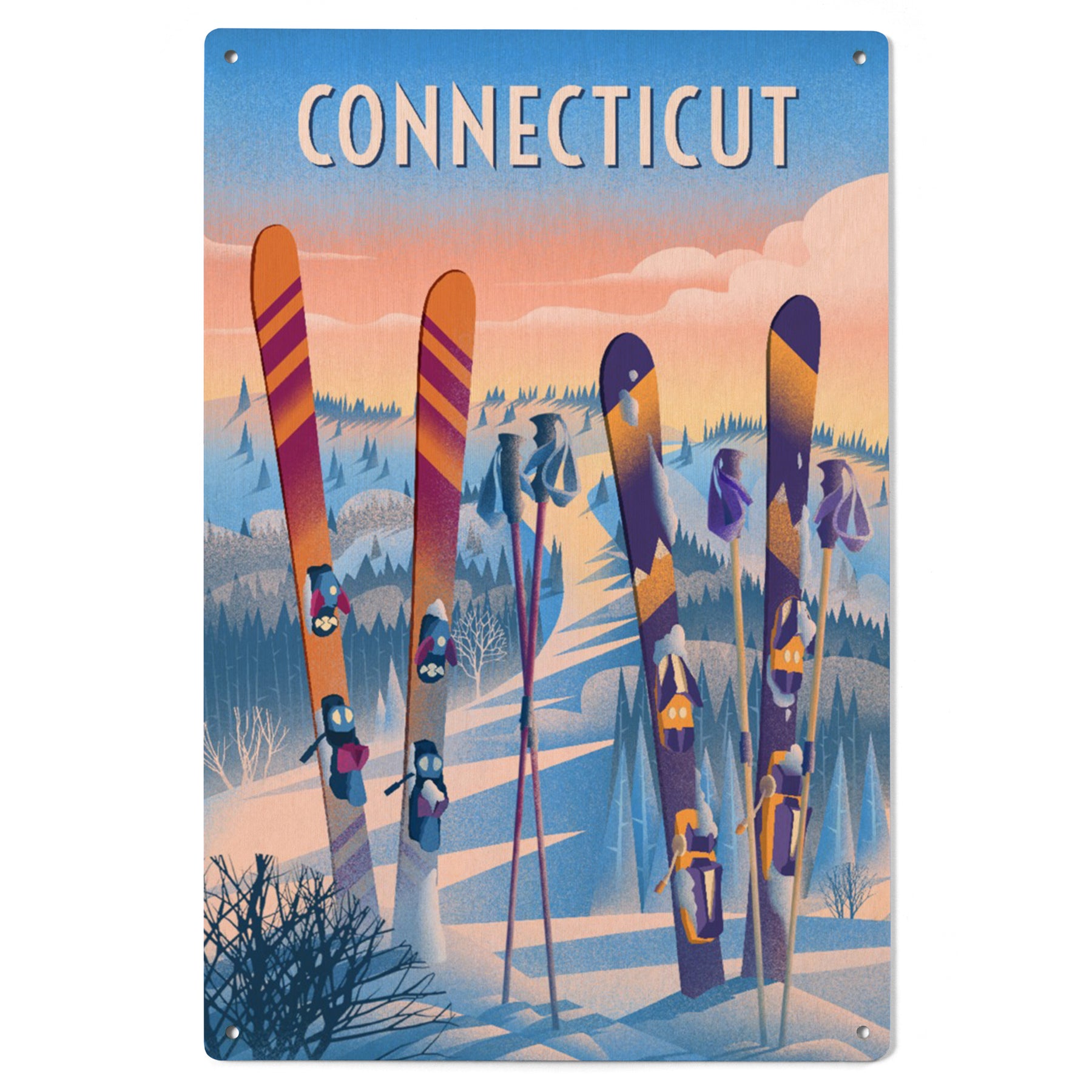 Connecticut, Prepare for Takeoff, Skis in Snowbank, Wood Signs and Postcards Wood Lantern Press