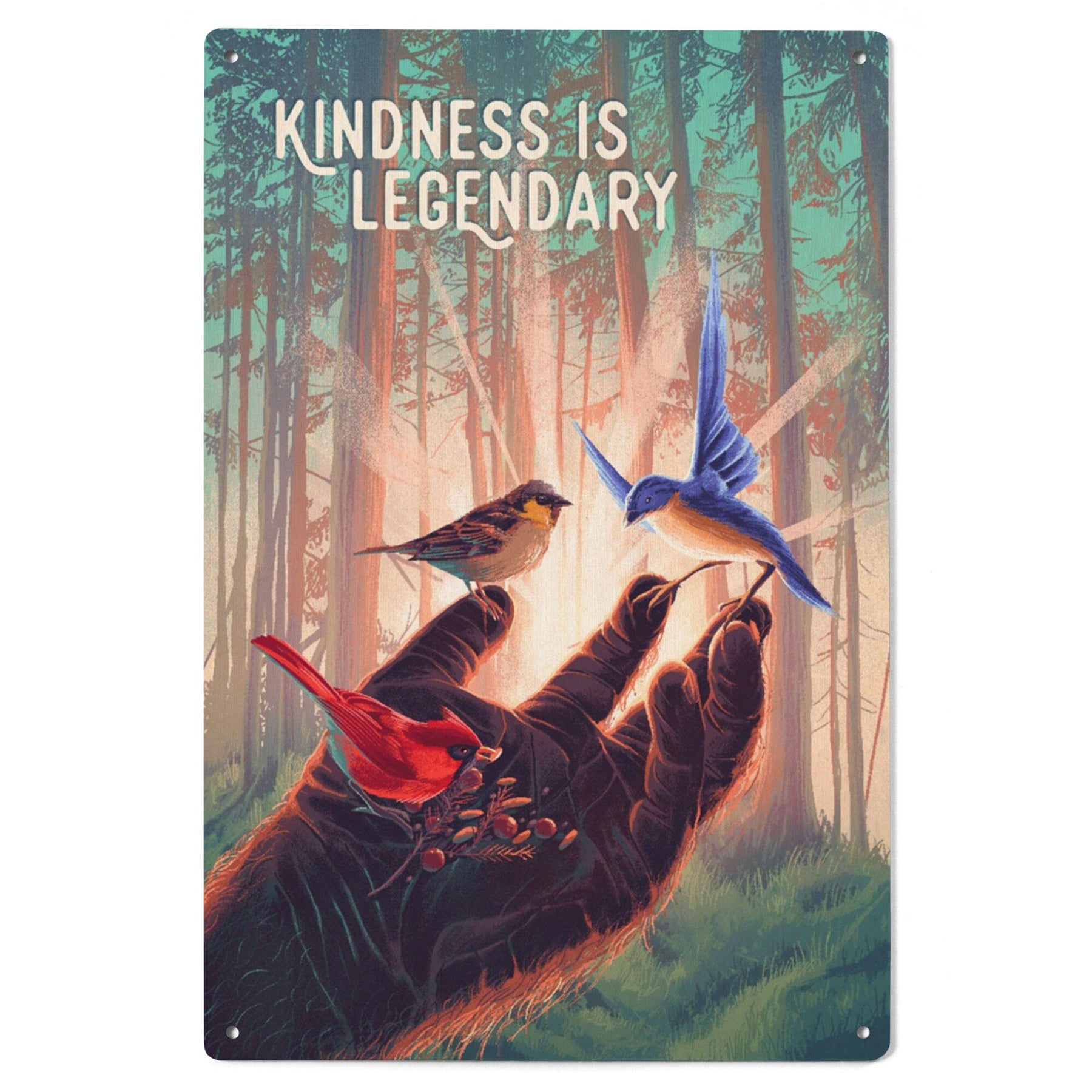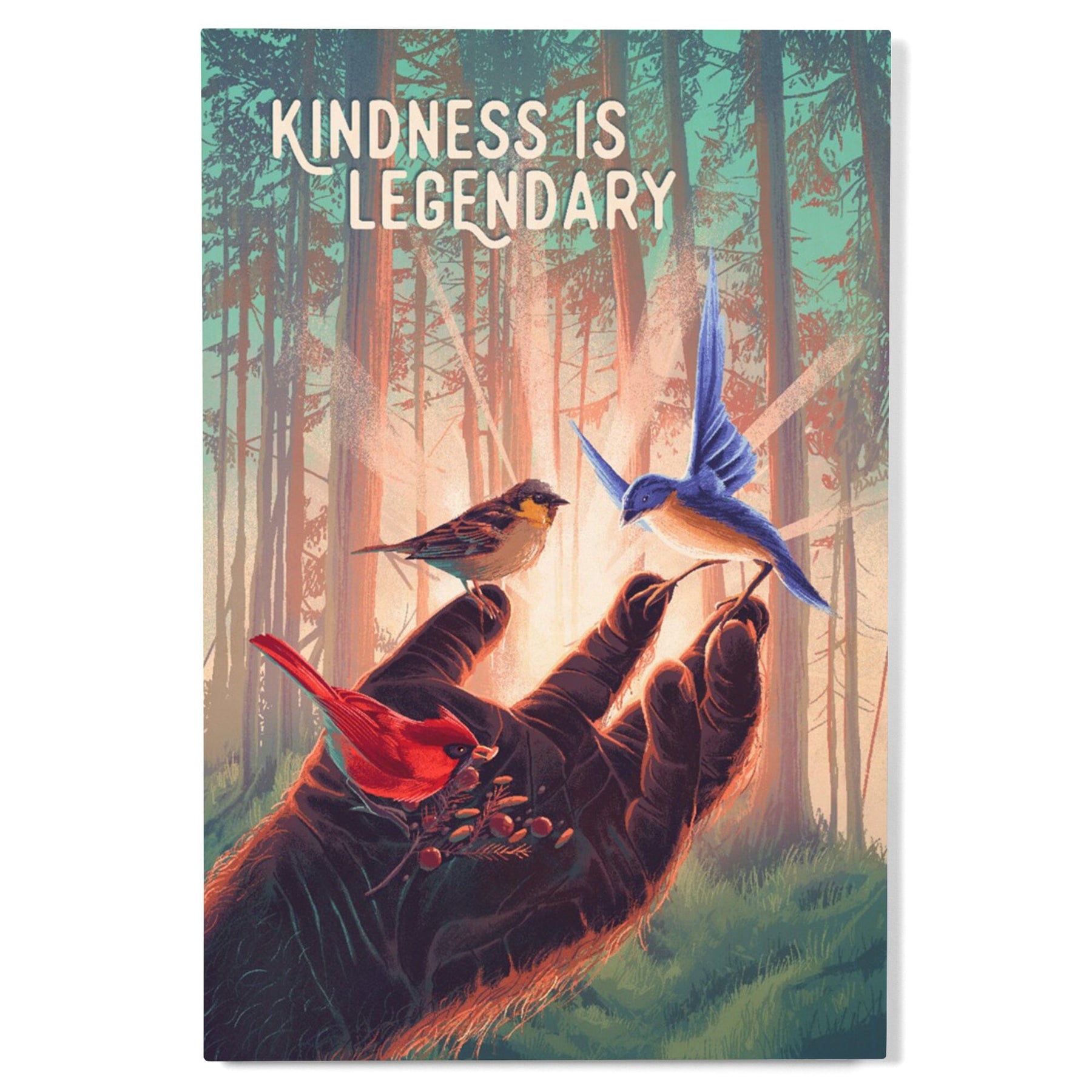 Kindness is Legendary, Bigfoot With Birds, Wood Signs and Postcards Wood Lantern Press