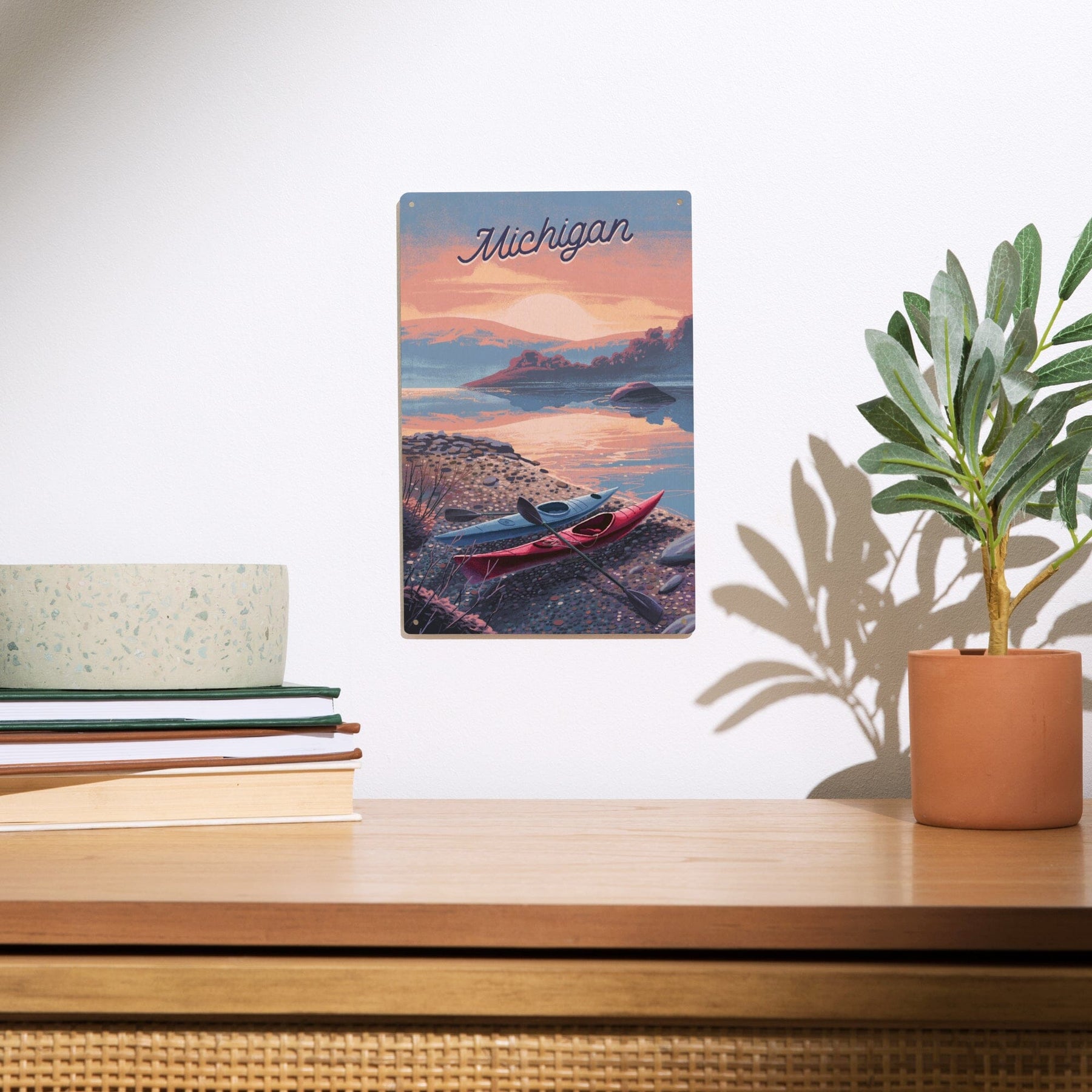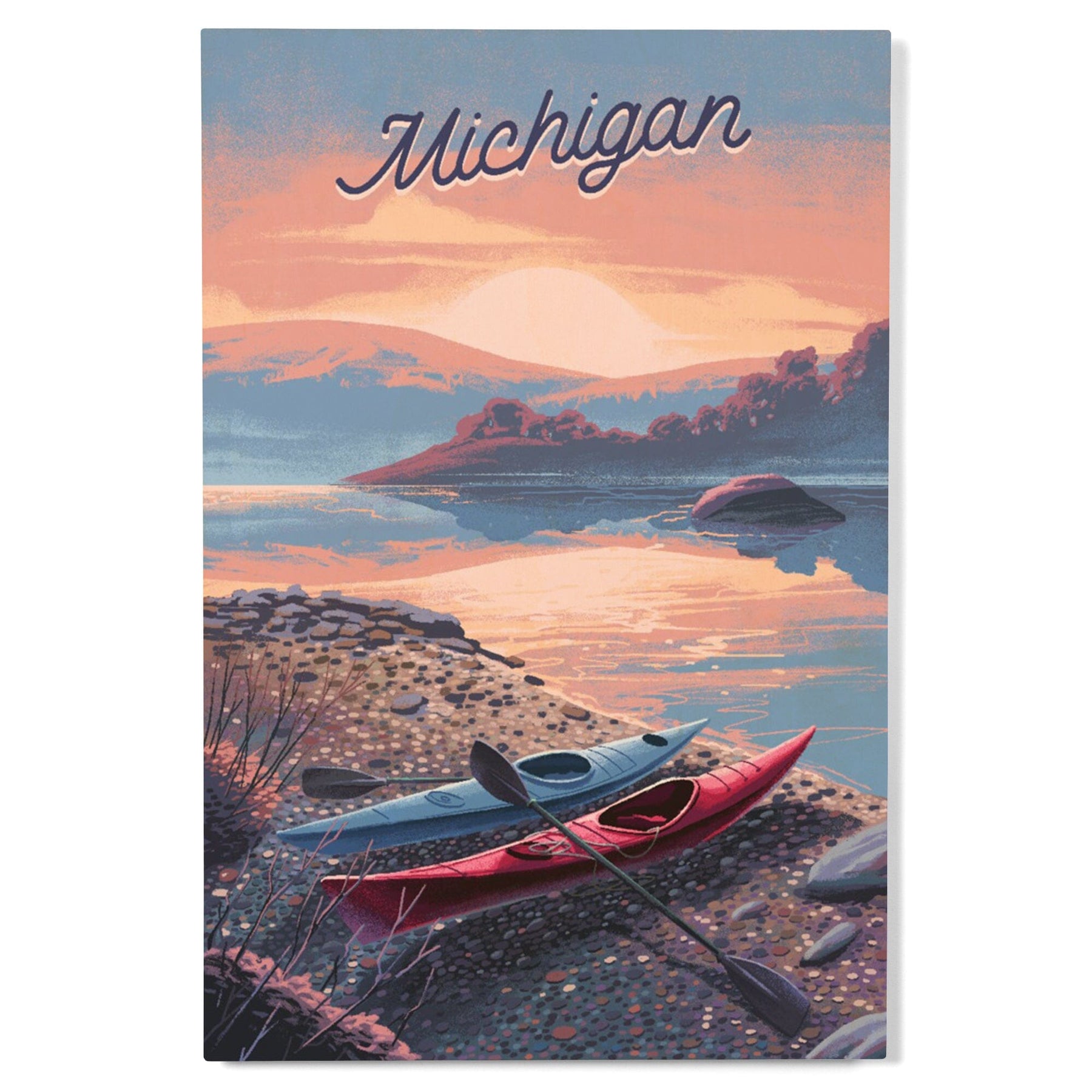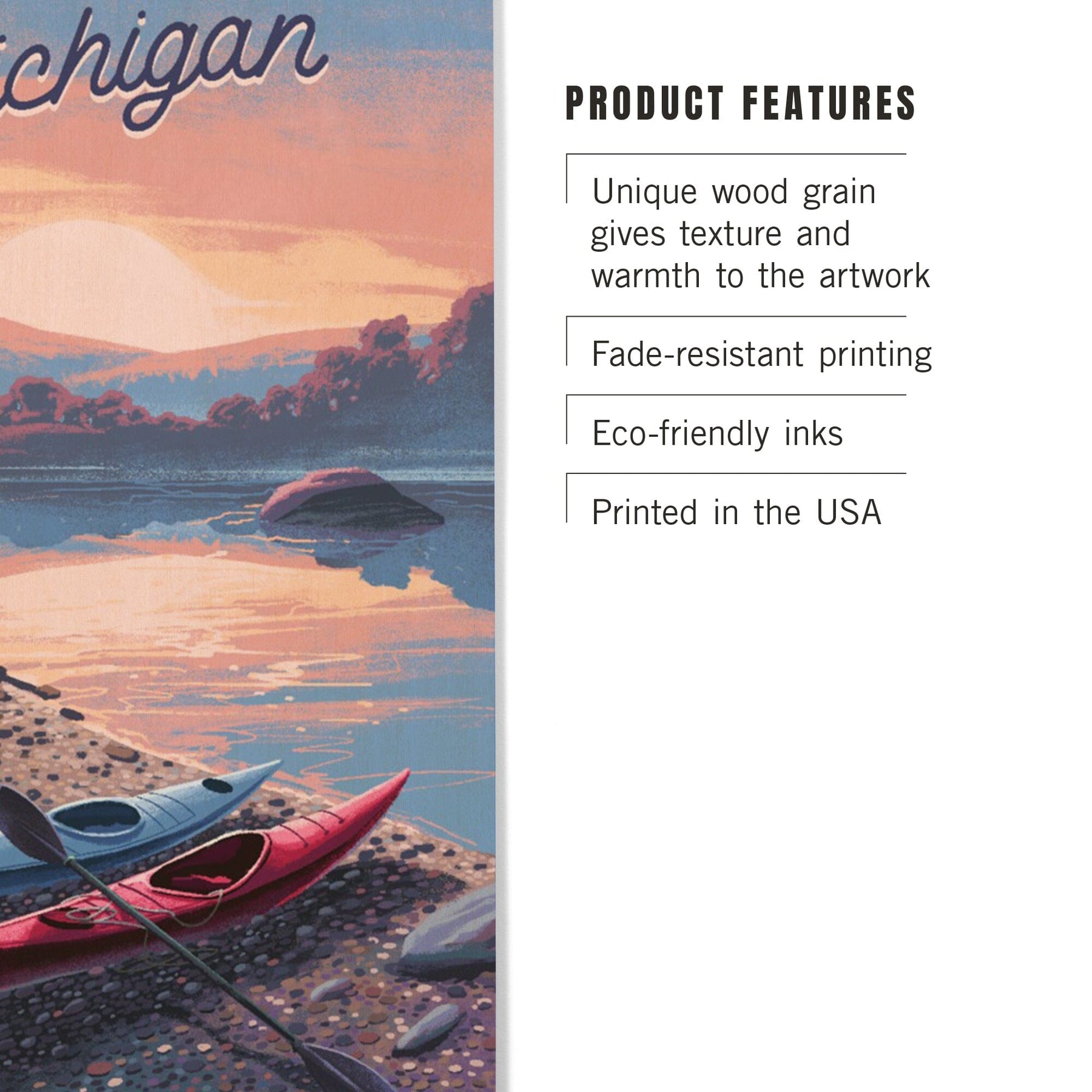 Michigan, Glassy Sunrise, Kayak, Wood Signs and Postcards Wood Lantern Press