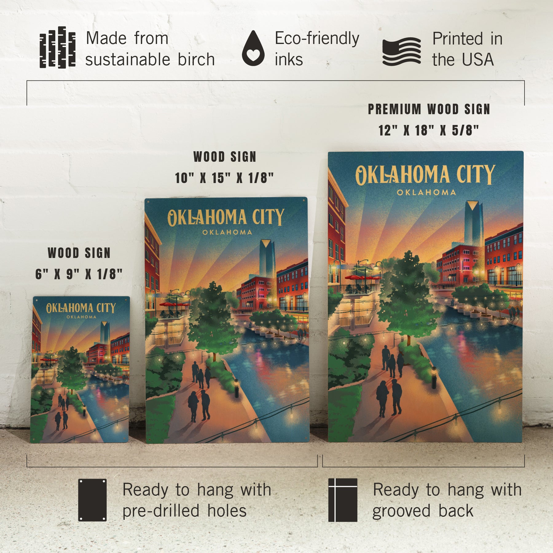 Oklahoma City, Oklahoma, Lithograph, River Walk, Wood Signs and Postcards