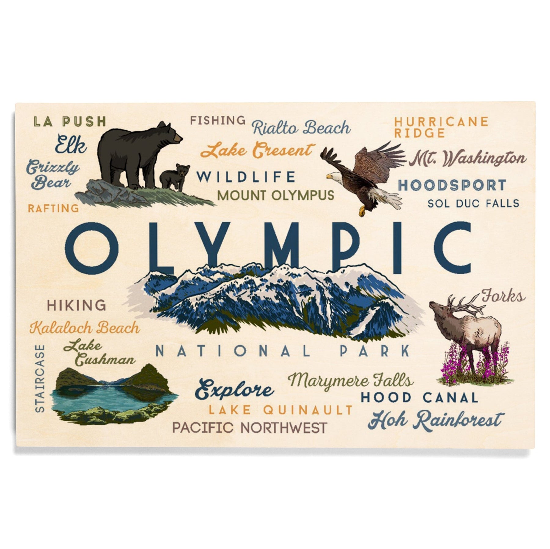 Olympic National Park, Washington, Mountain Range, Typography and Icons, Wood Signs and Postcards Wood Lantern Press
