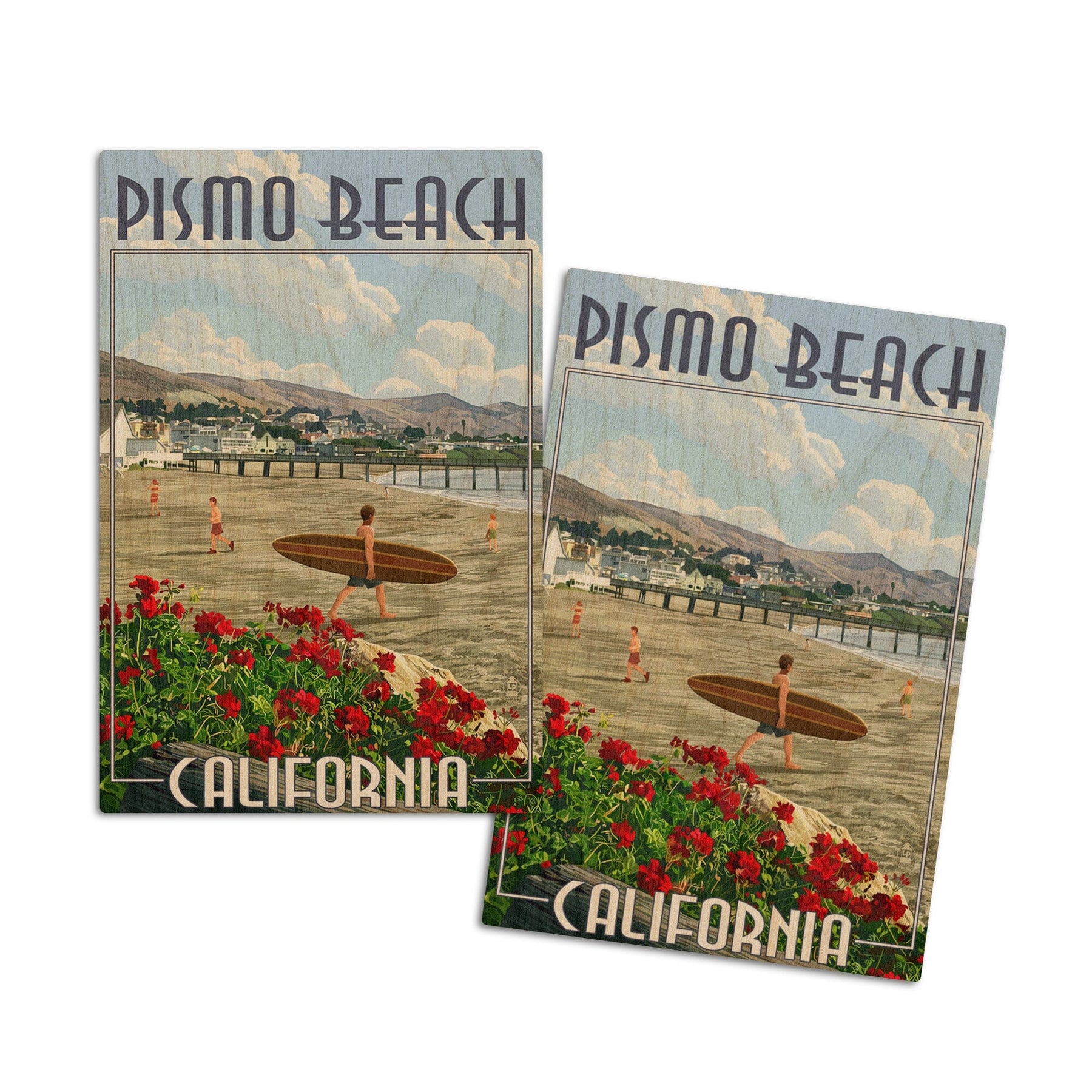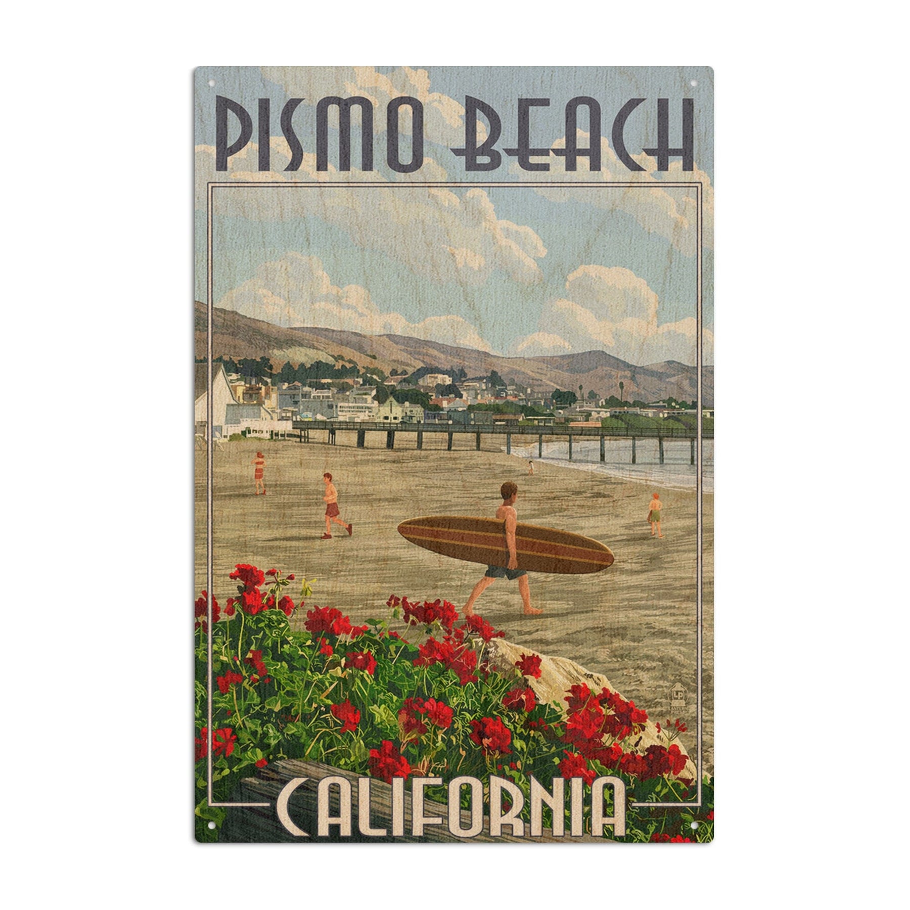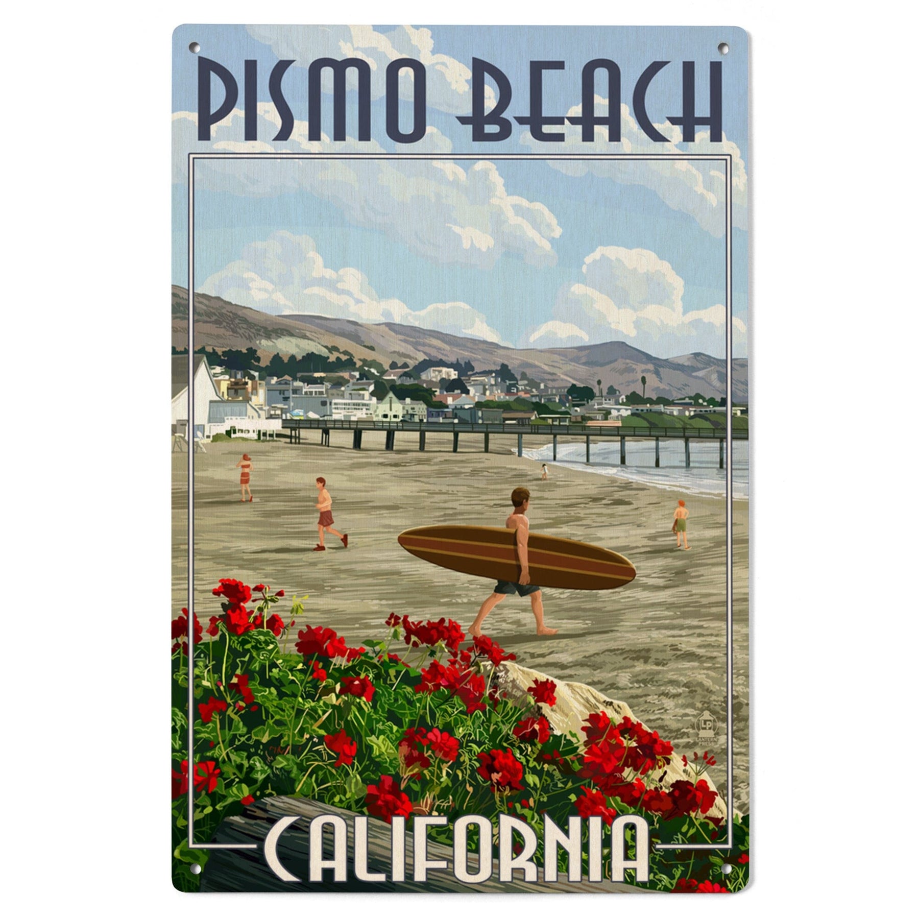 Pismo Beach, California, Beach and Surfer Scene, Lantern Press Artwork, Wood Signs and Postcards Wood Lantern Press