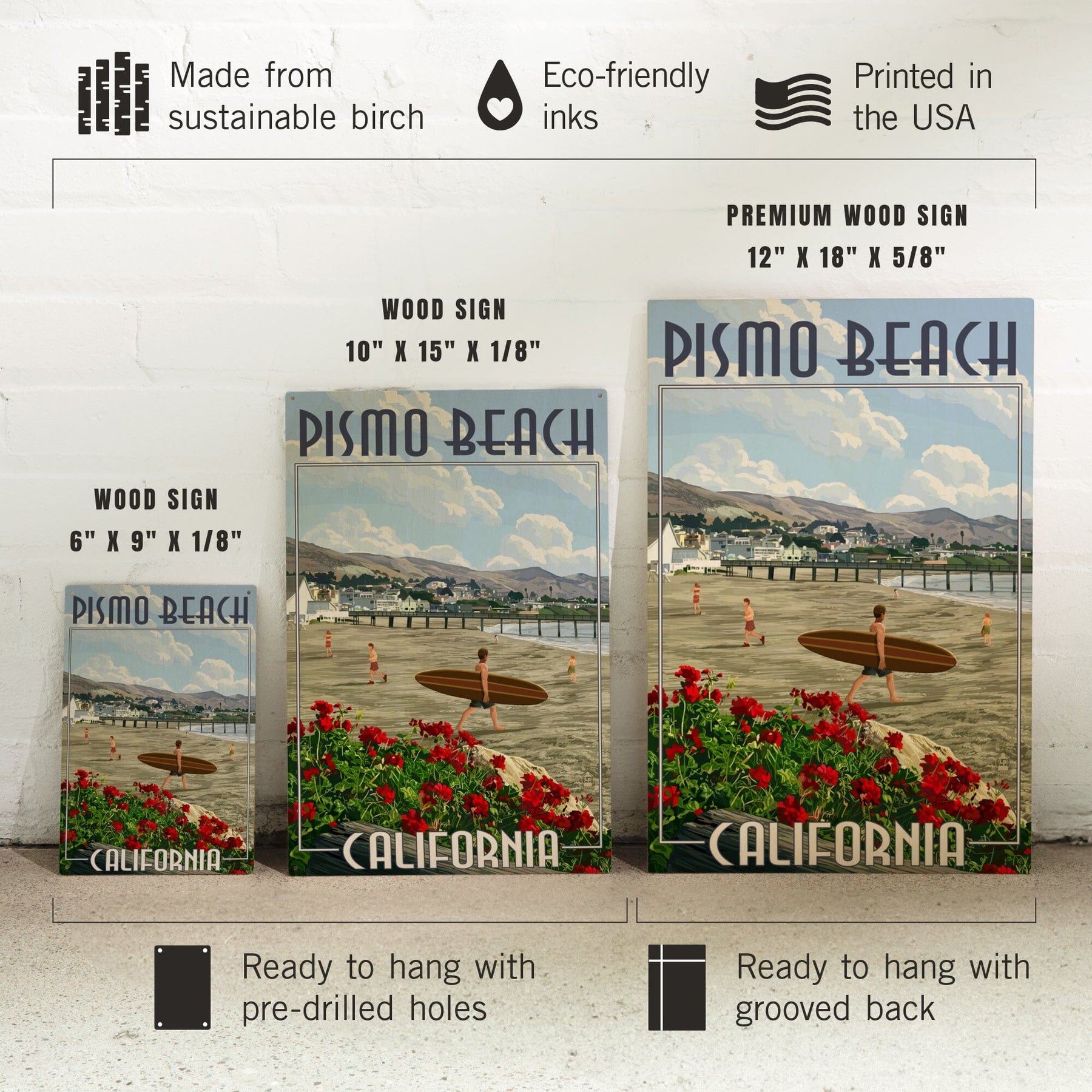 Pismo Beach, California, Beach and Surfer Scene, Lantern Press Artwork, Wood Signs and Postcards