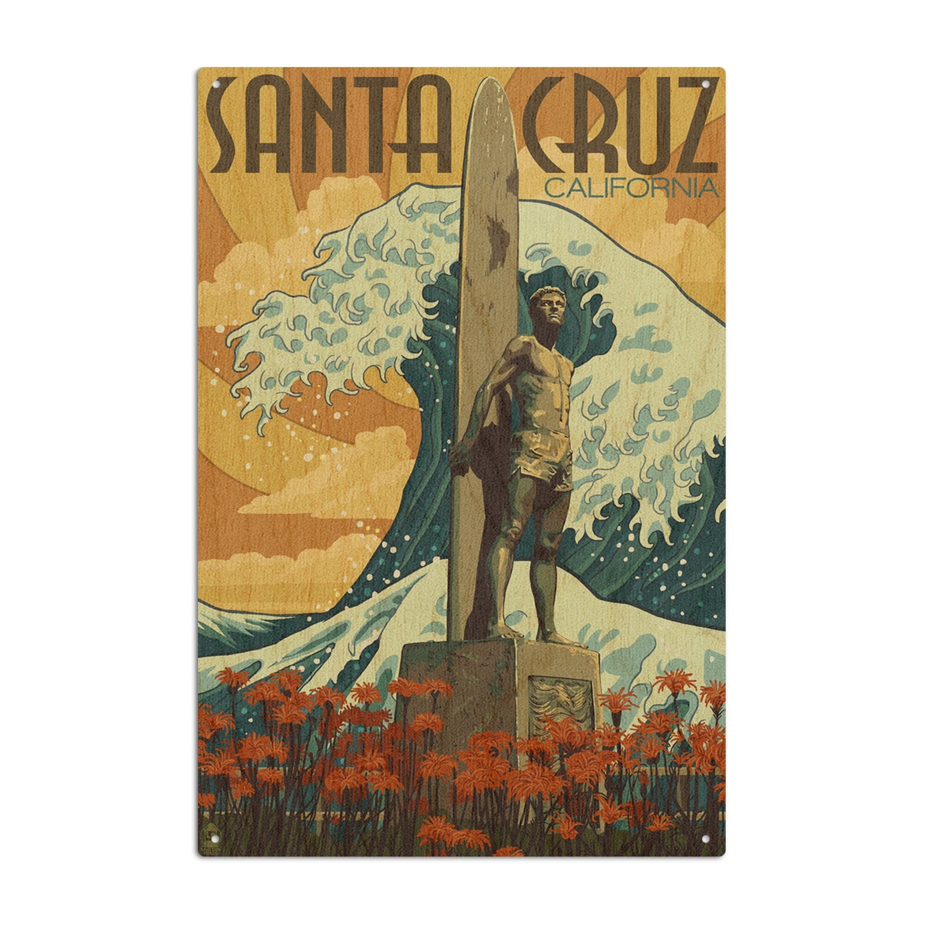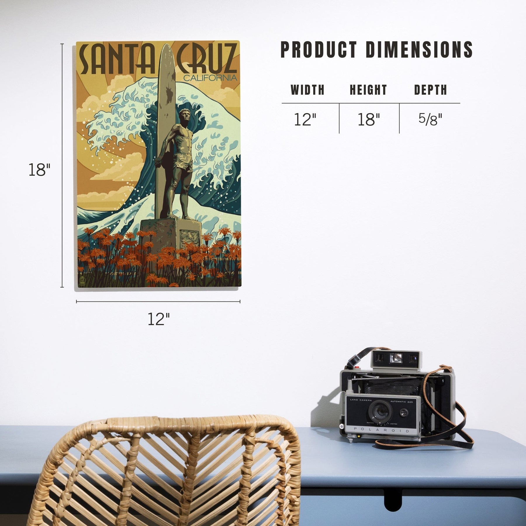 Santa Cruz, California, Surfer Statue, Lantern Press Artwork, Wood Signs and Postcards Wood Lantern Press