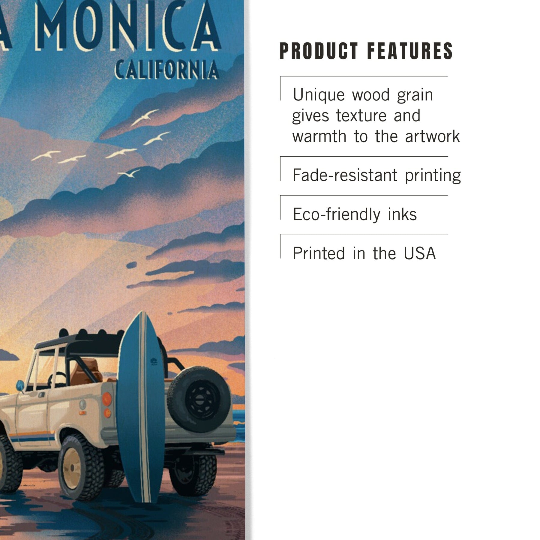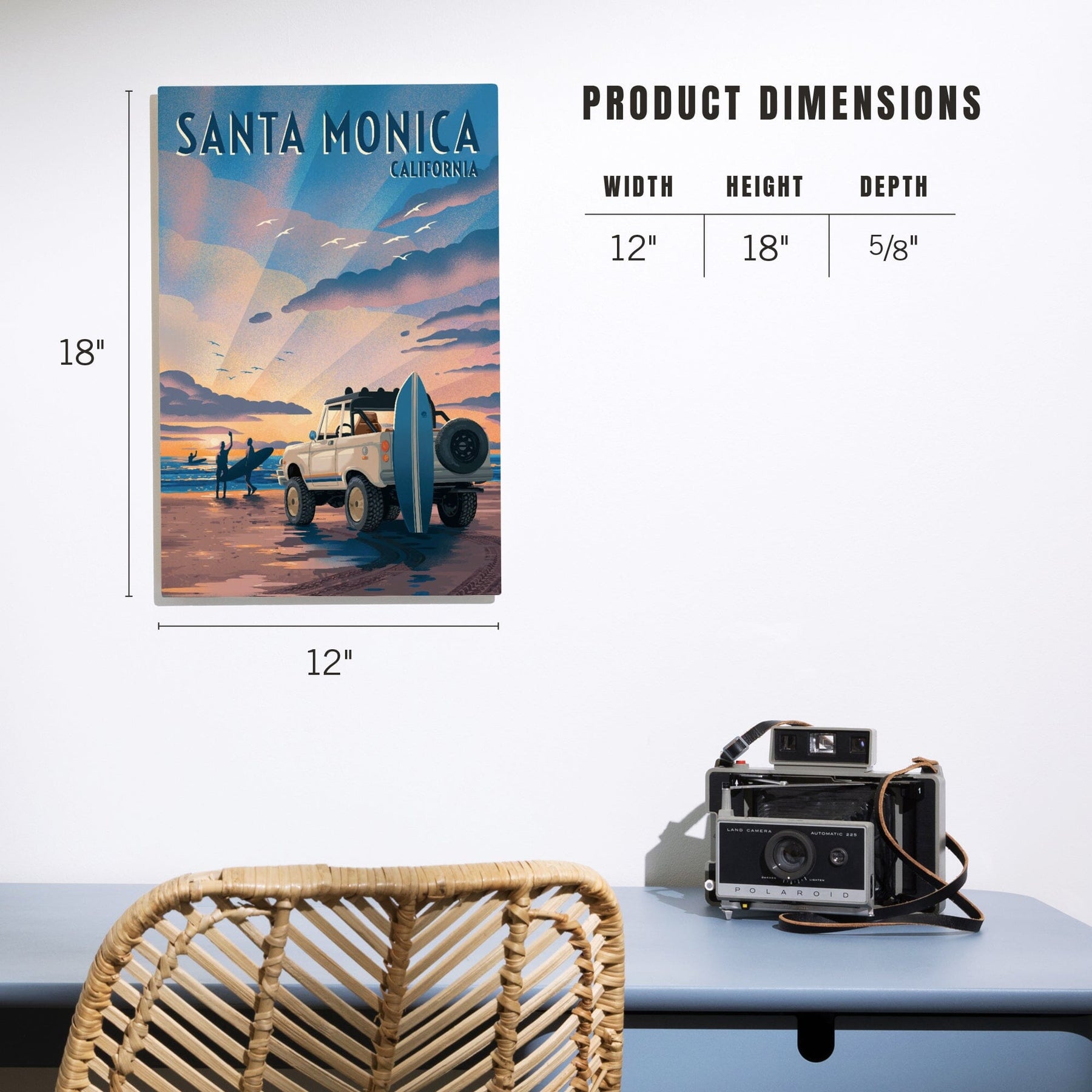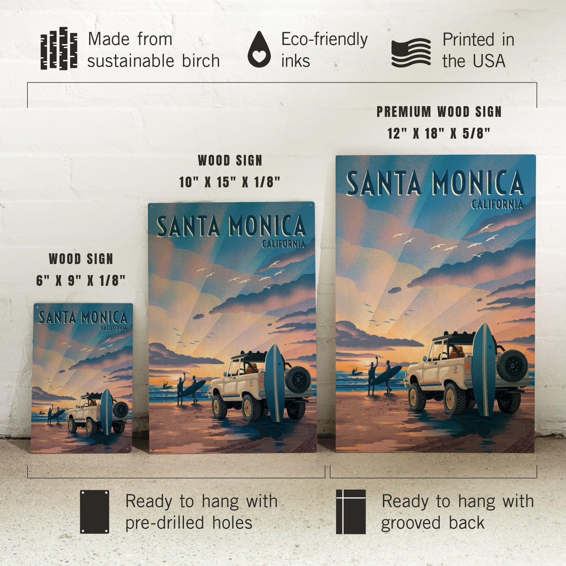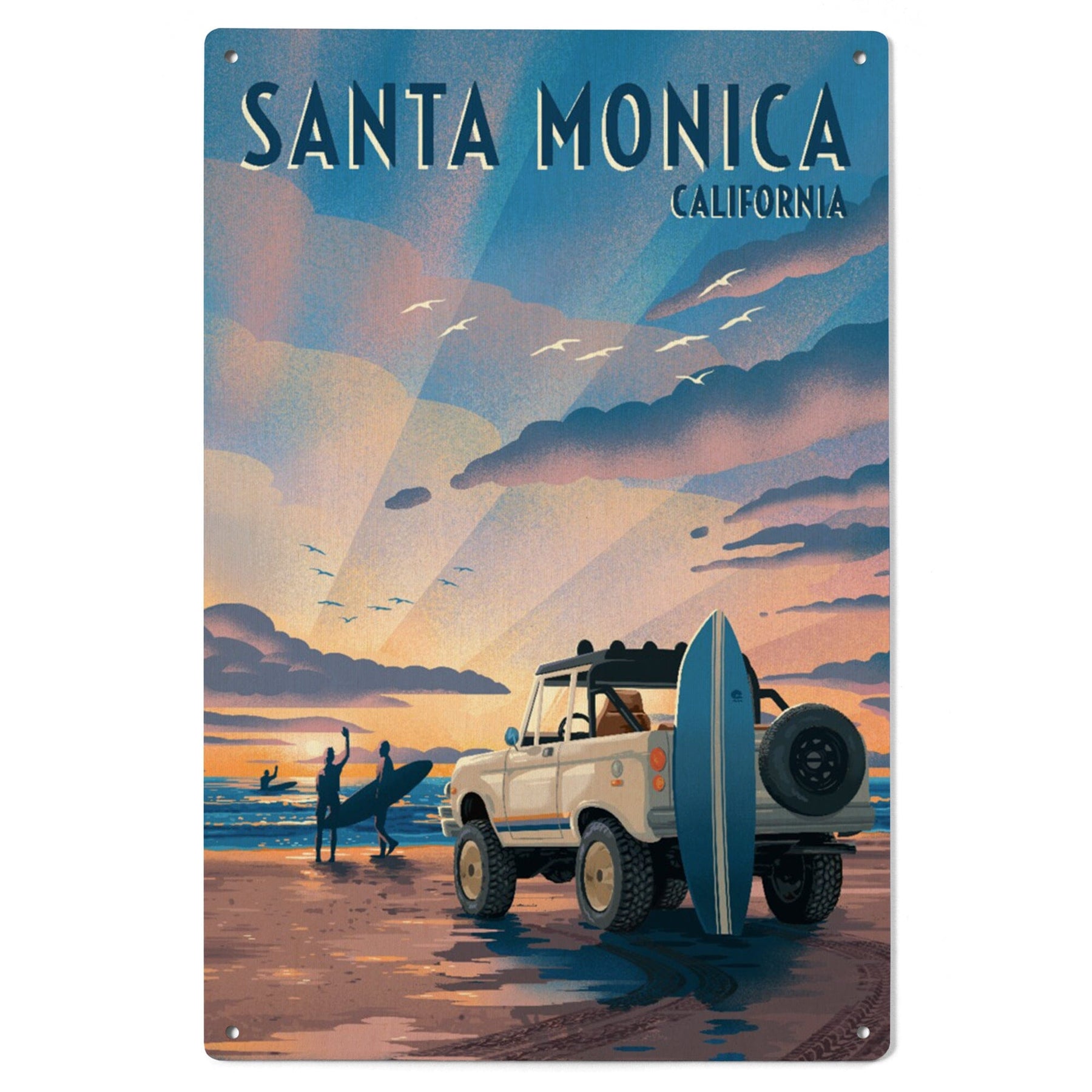 Santa Monica, California, Lithograph, Wake Up! Surf's Up!, Surfers on Beach, Wood Signs and Postcards