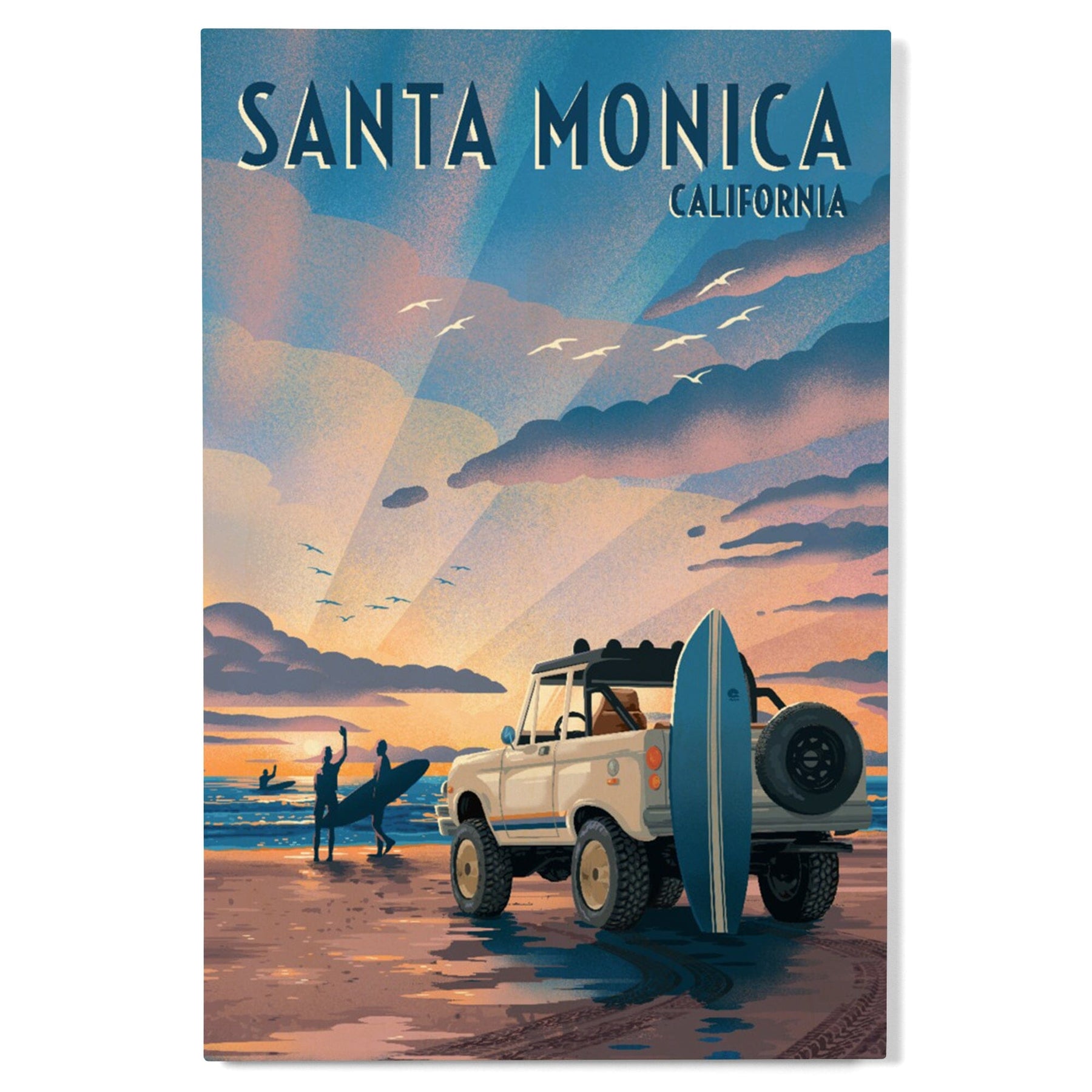 Santa Monica, California, Lithograph, Wake Up! Surf's Up!, Surfers on Beach, Wood Signs and Postcards Wood Lantern Press