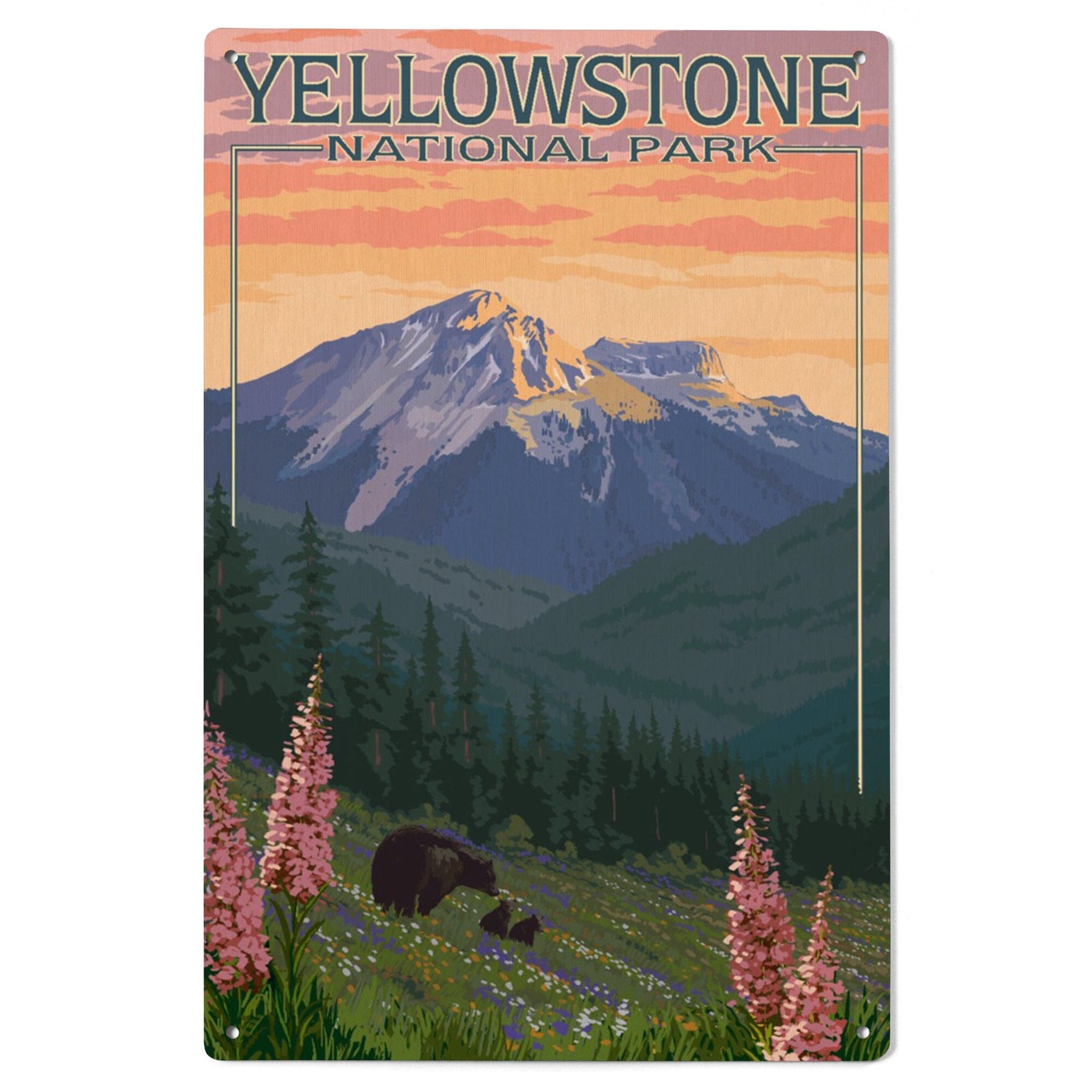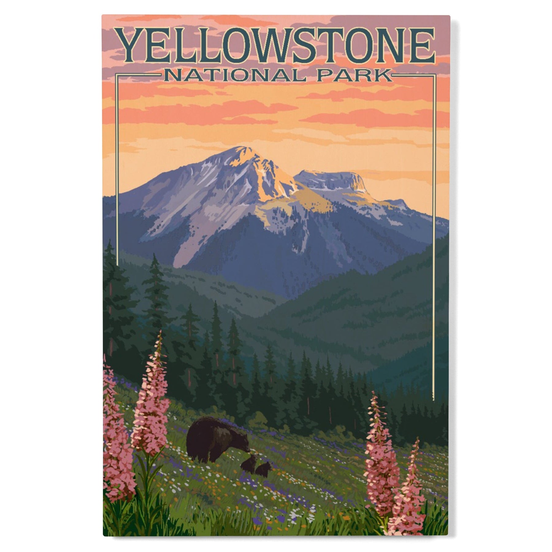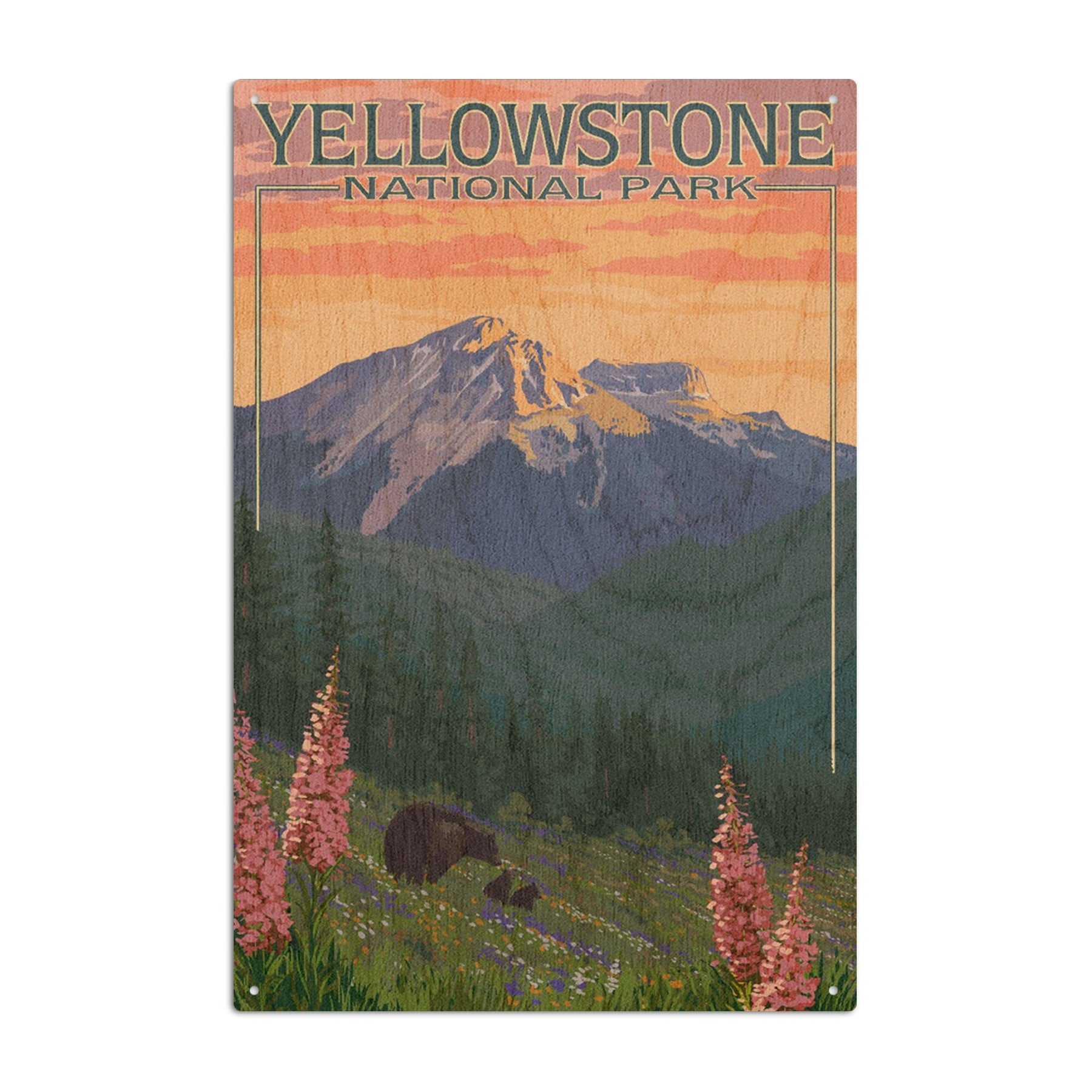 Yellowstone National Park, Bear & Spring Flowers, Lantern Press Artwork, Wood Signs and Postcards Wood Lantern Press