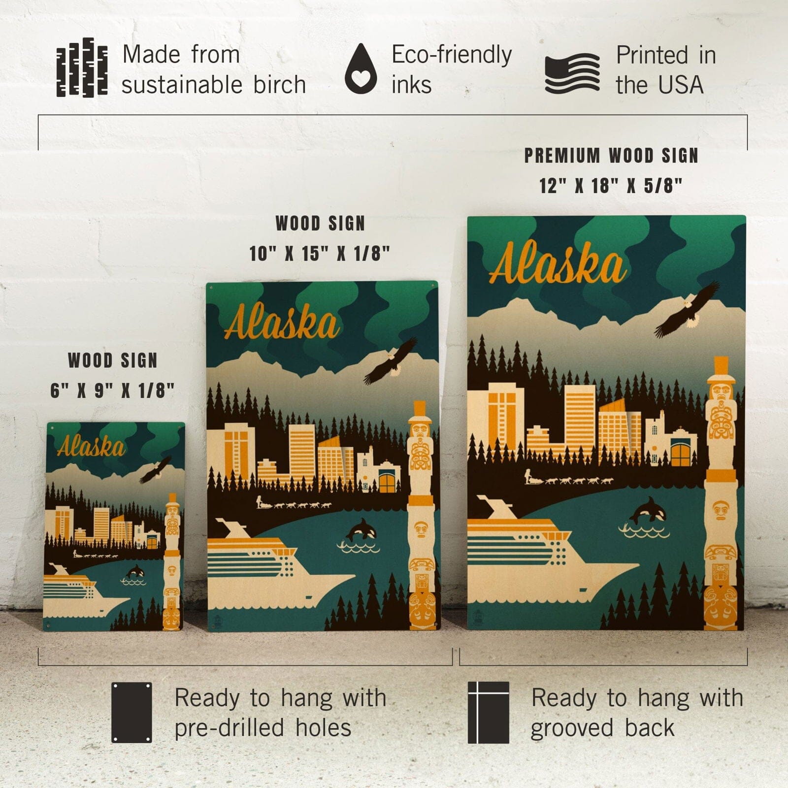 Alaska, Retro Skyline, Lantern Press Artwork, Wood Signs and Postcards